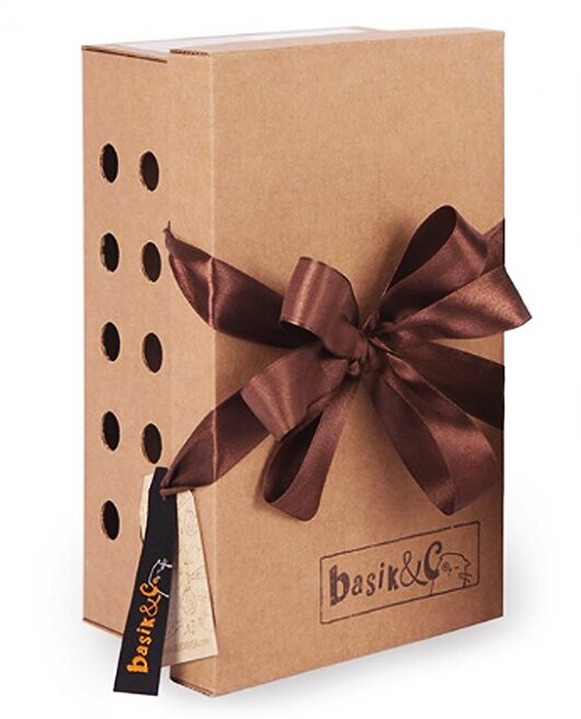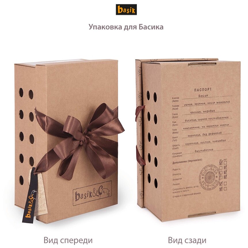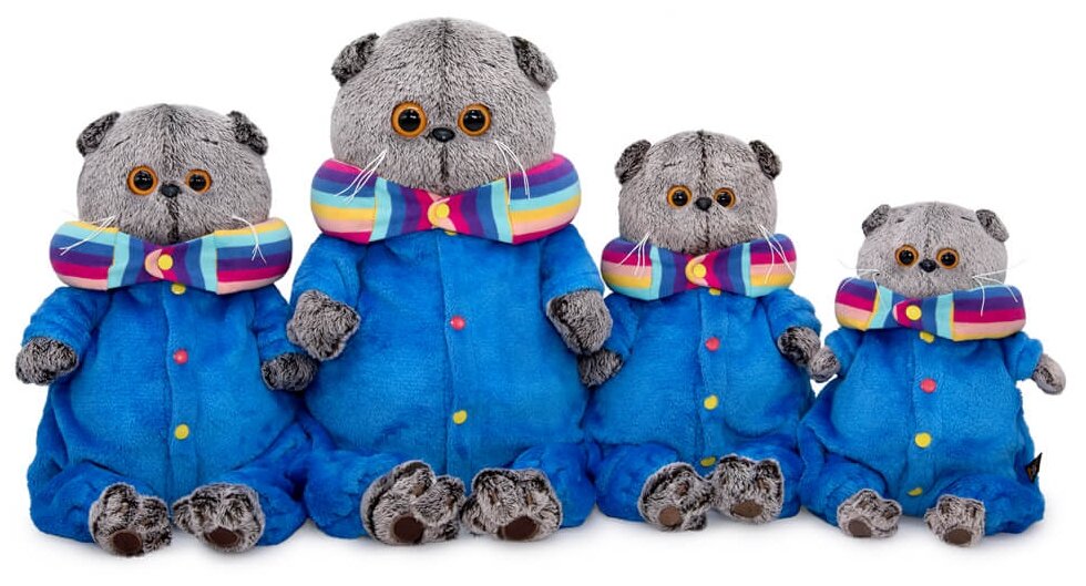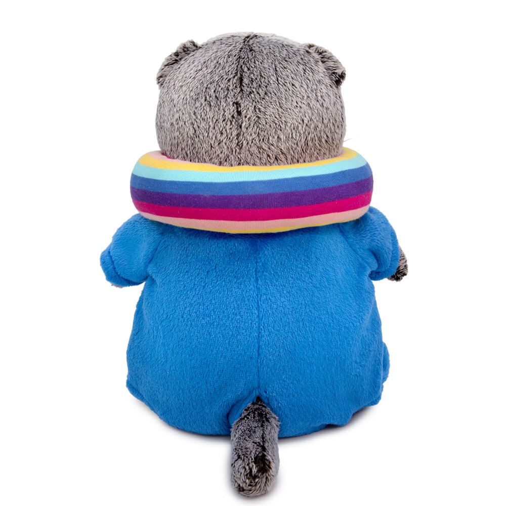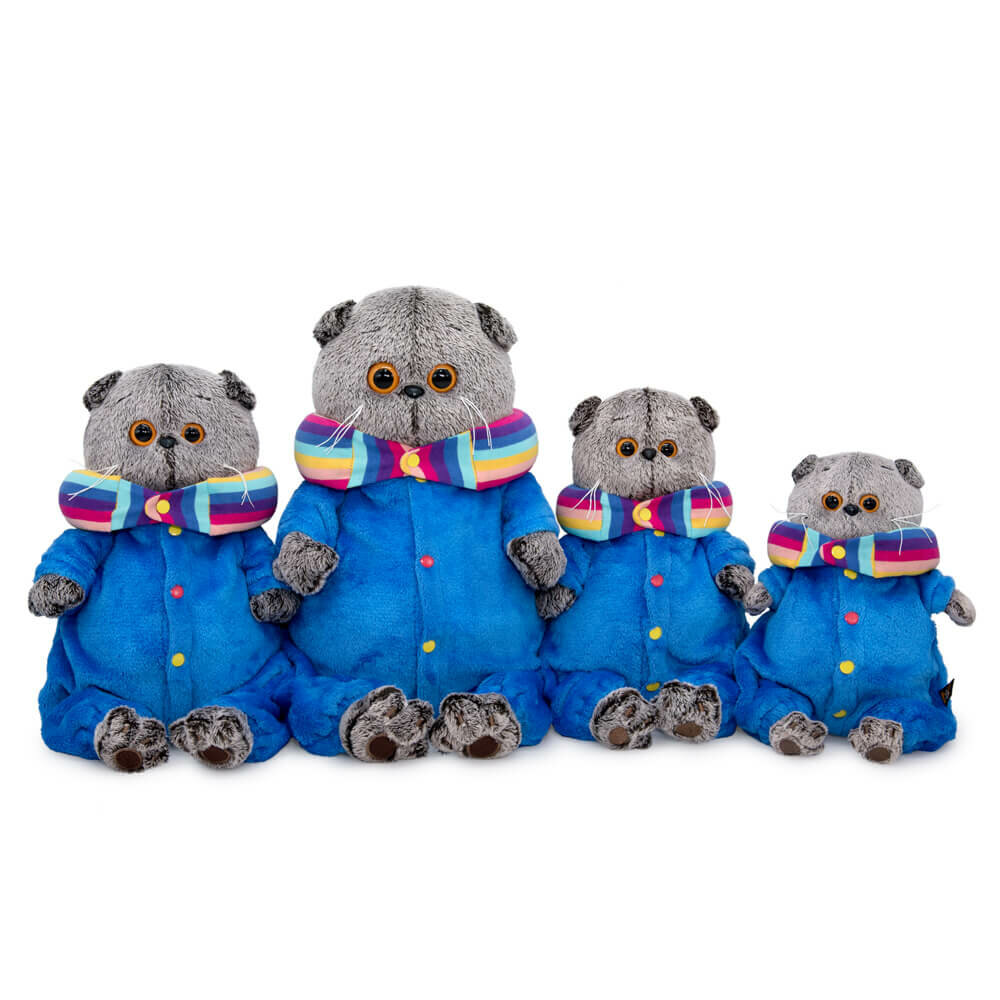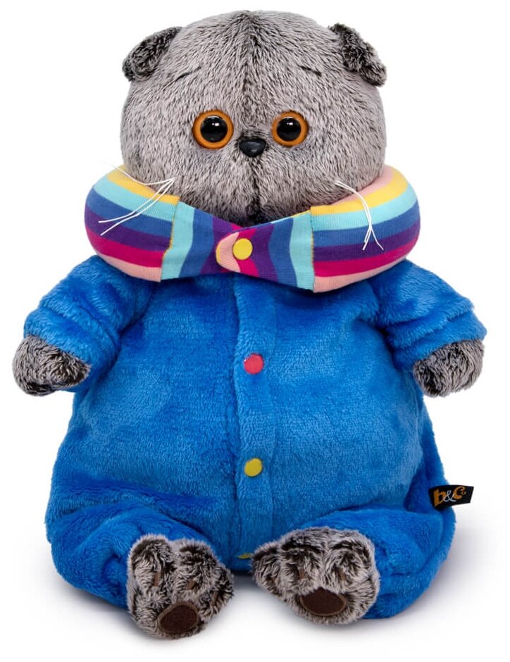 Кот Басик в теплом костюме. Курточка из очень мягкого меха цвета морской волны, с капюшоном и на тракторной молнии в тон. На курточке украшение — алое сердечко из фетра. В комплекте широкие, уютные штанишки из флиса цвета весеннего бутона. Игрушка поставляется в закрытой подарочной коробке, подвязанной атласными лентами.