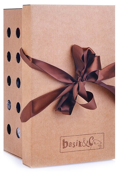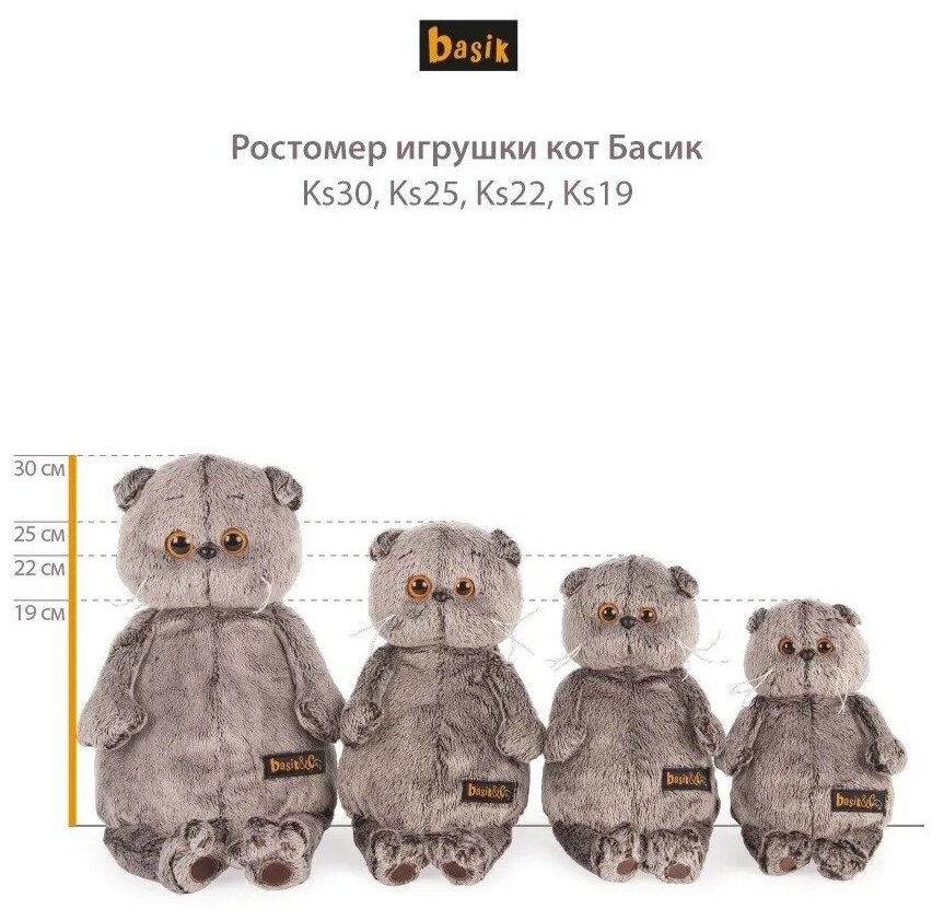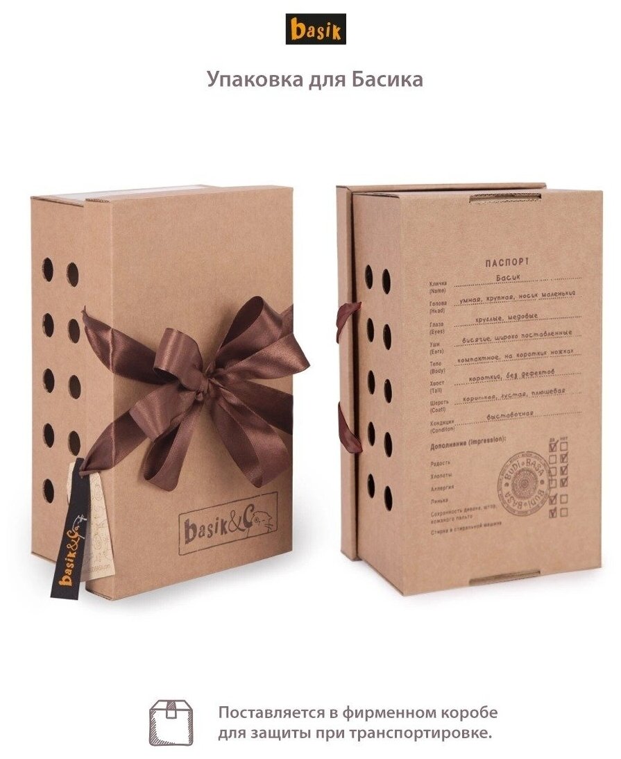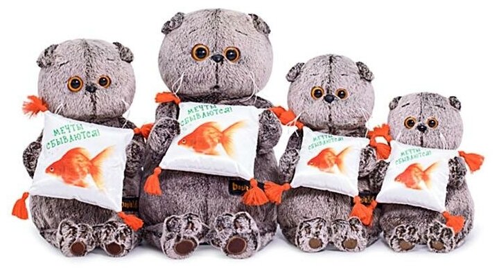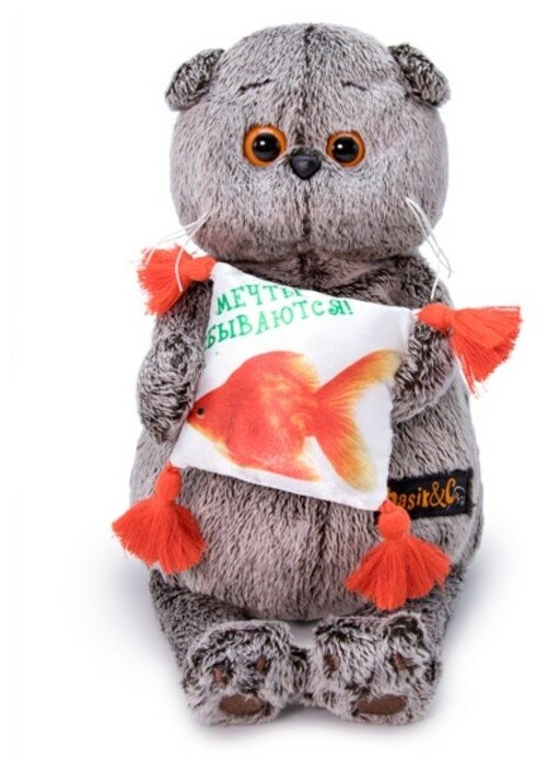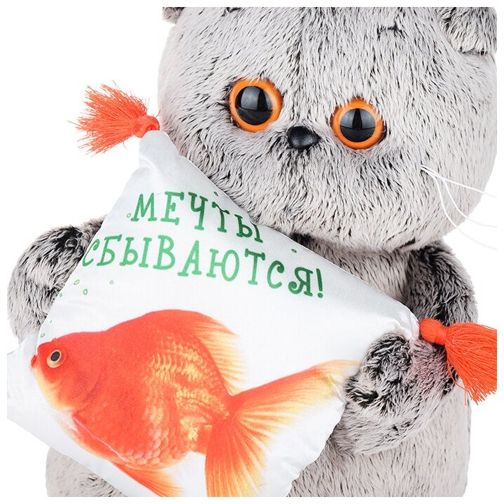 Басик держит в лапках необычную шелковистую подушечку. На подушечке принт в виде золотой рыбки и надпись «Мечты сбываются», также на концах подушки ярко-оранжевые кисточки. Игрушка поставляется в закрытой подарочной коробке, подвязанной атласными лентами.