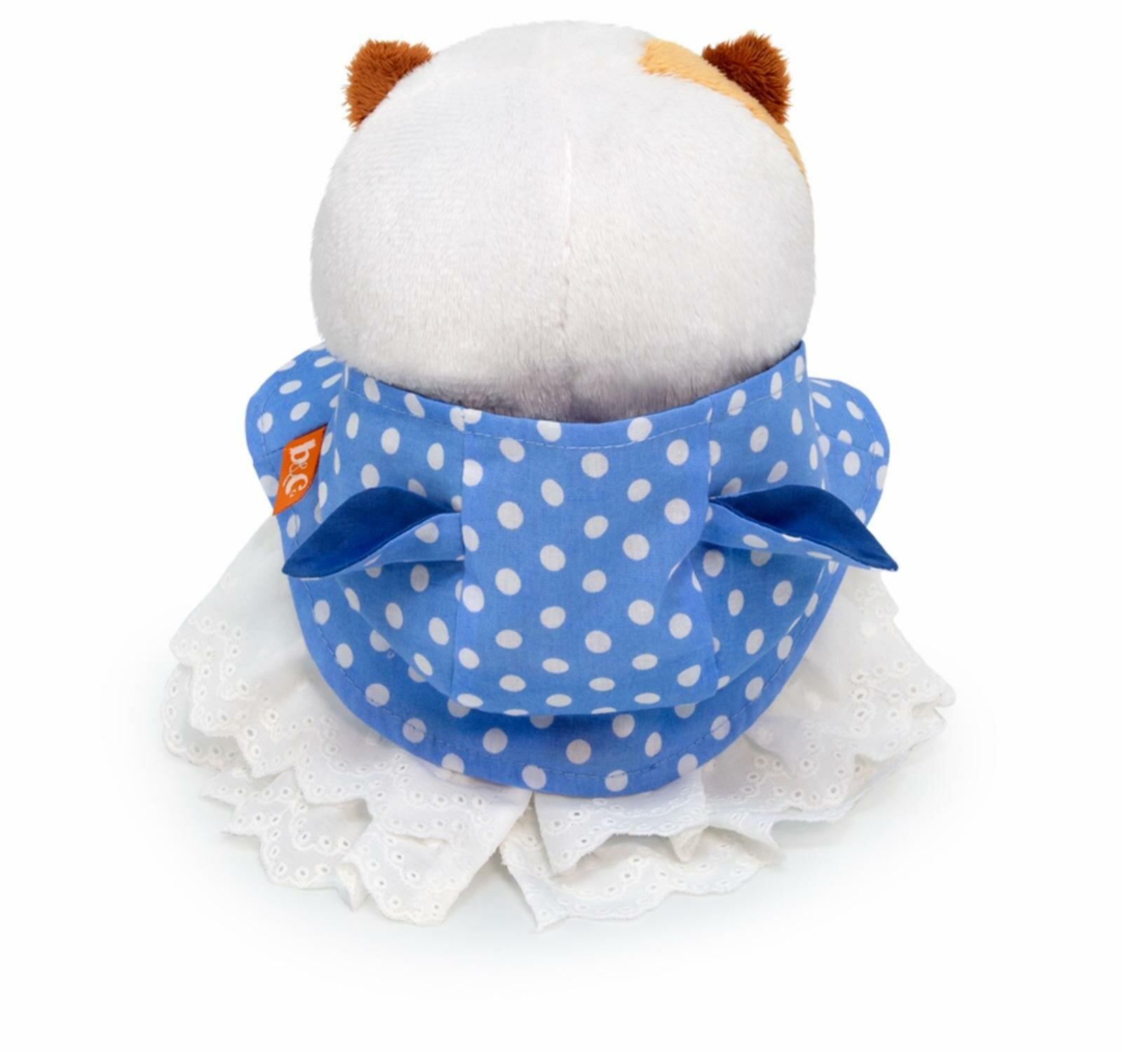 Кошечка Ли-Ли BABY – очень трогательная малышка, которая произведет впечатление не только на детей, но и на взрослую прекрасную половину человечества! Малышка Лиличка в необычном кейпе с ушками на капюшоне. Двубортный кейп сшит из плотного хлопка цвета голубой пудры в белый горох на четырех белых пуговках. Также в комплекте пышная юбочка из х/б шитья молочного цвета. Игрушка поставляется в закрытой подарочной коробке, подвязанной атласными лентами.