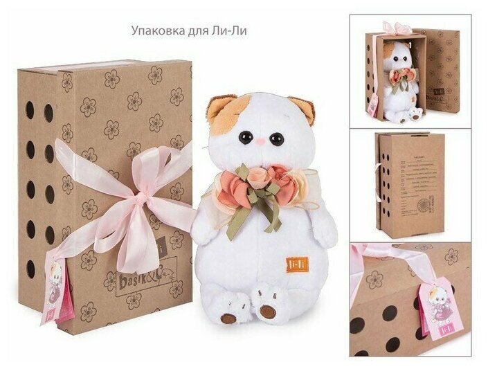Сегодня Ли‑Ли нарядилась в необычный наряд! На ней платье из плотного хлопка цвета пустынных цветов, охристый жилет в клетку из тонкой костюмной ткани и длинный невесомый шарфик цвета корицы из жатой ткани с блеском. Также в комплекте милый значок с портретом любимого дружочка Басика. Игрушка поставляется в закрытой подарочной коробке, подвязанной атласными лентами.