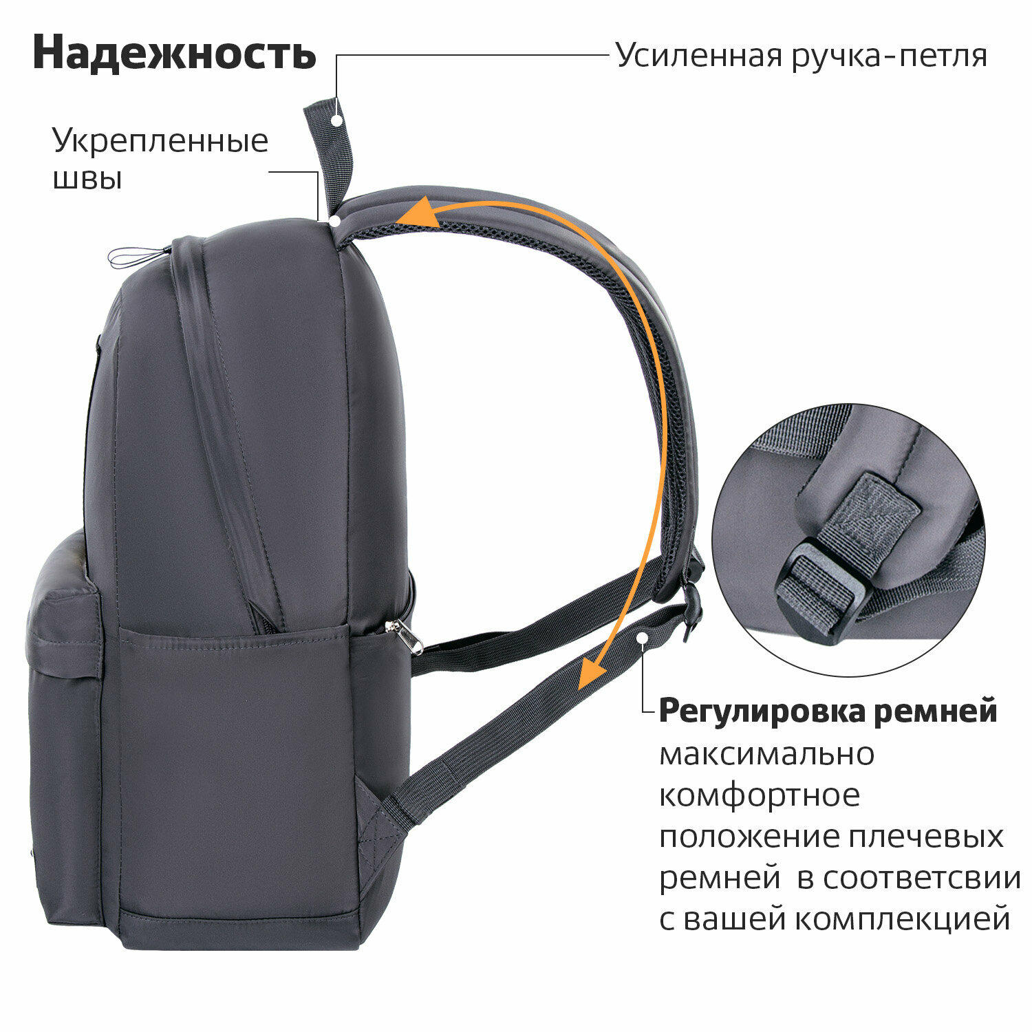 Тканевые боковые карманы имеют достаточный объем, чтобы разместить в них бутылочку с водой, термос, зонт, салфетки и другие необходимые вещи, которые должны быть всегда под рукой. Благодаря прямому крою карманы не топорщатся, что придает элегантную форму рюкзаку. Нести рюкзак будет удобно не только на плечах, но и в руке за прочную уплотненную ручку.