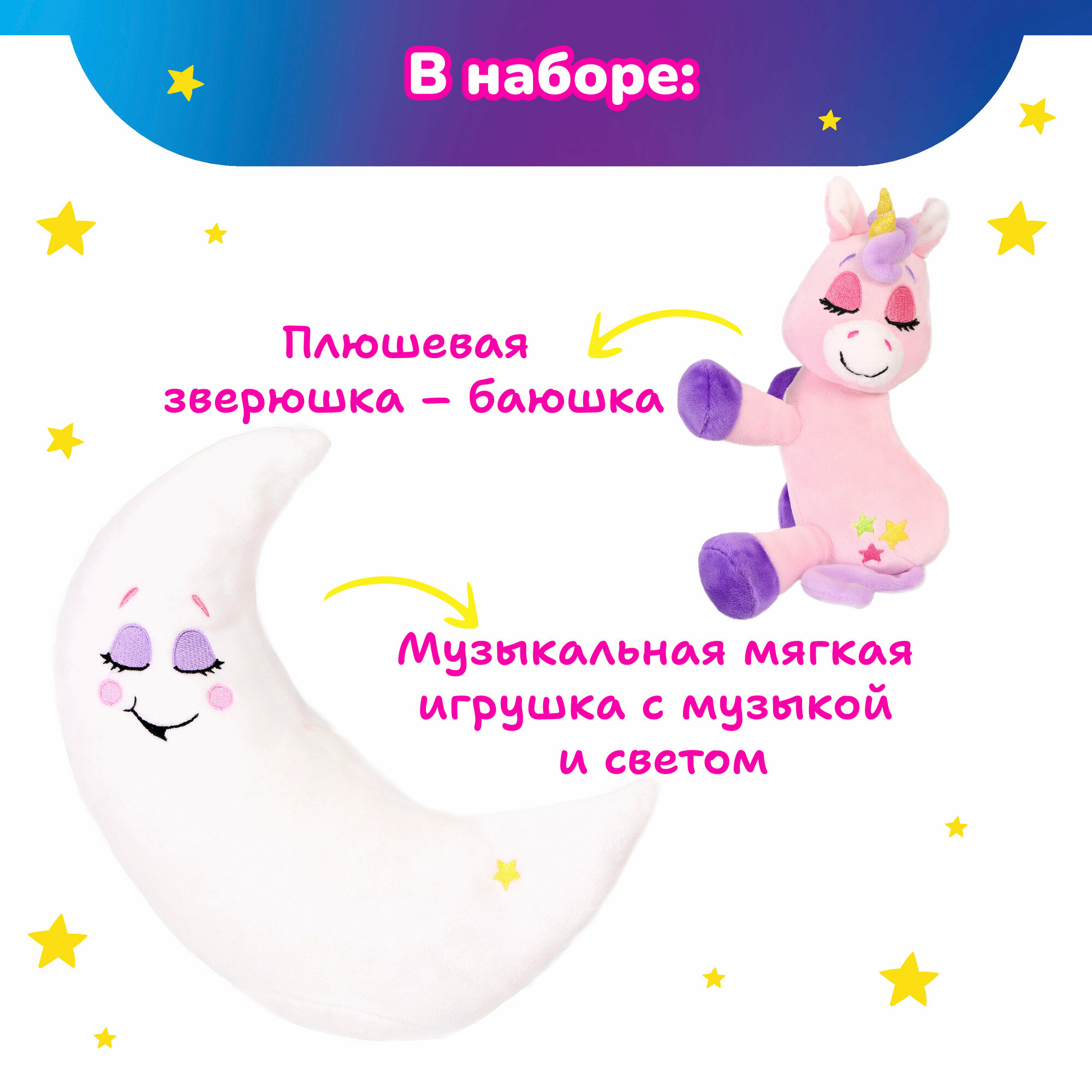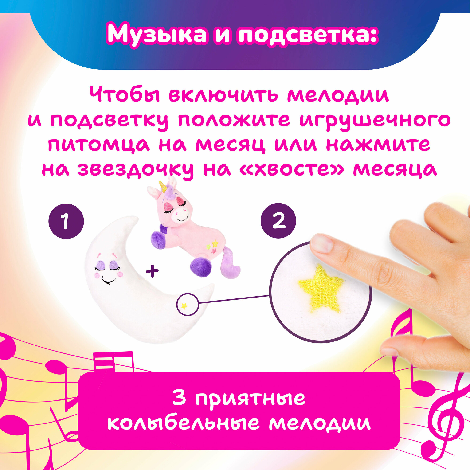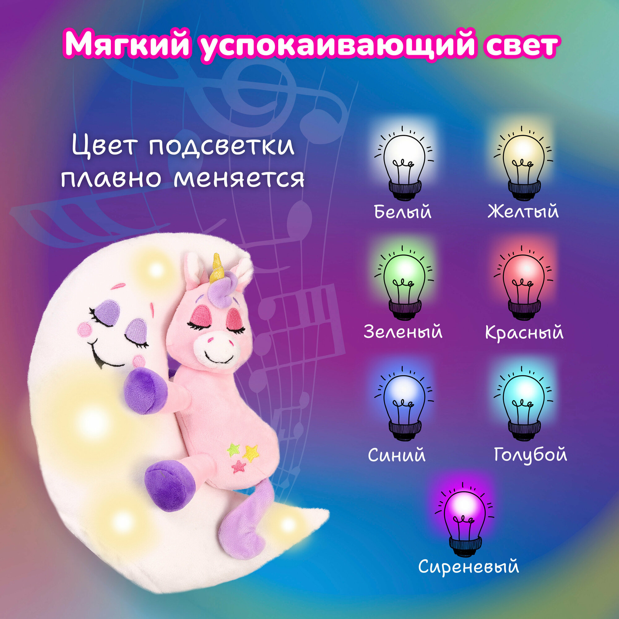 Зверюшка-баюшка Единорог бренда «Лунатики» - мягкая интерактивная игрушка с подсветкой и музыкой для девочек и мальчиков от 3-х лет.