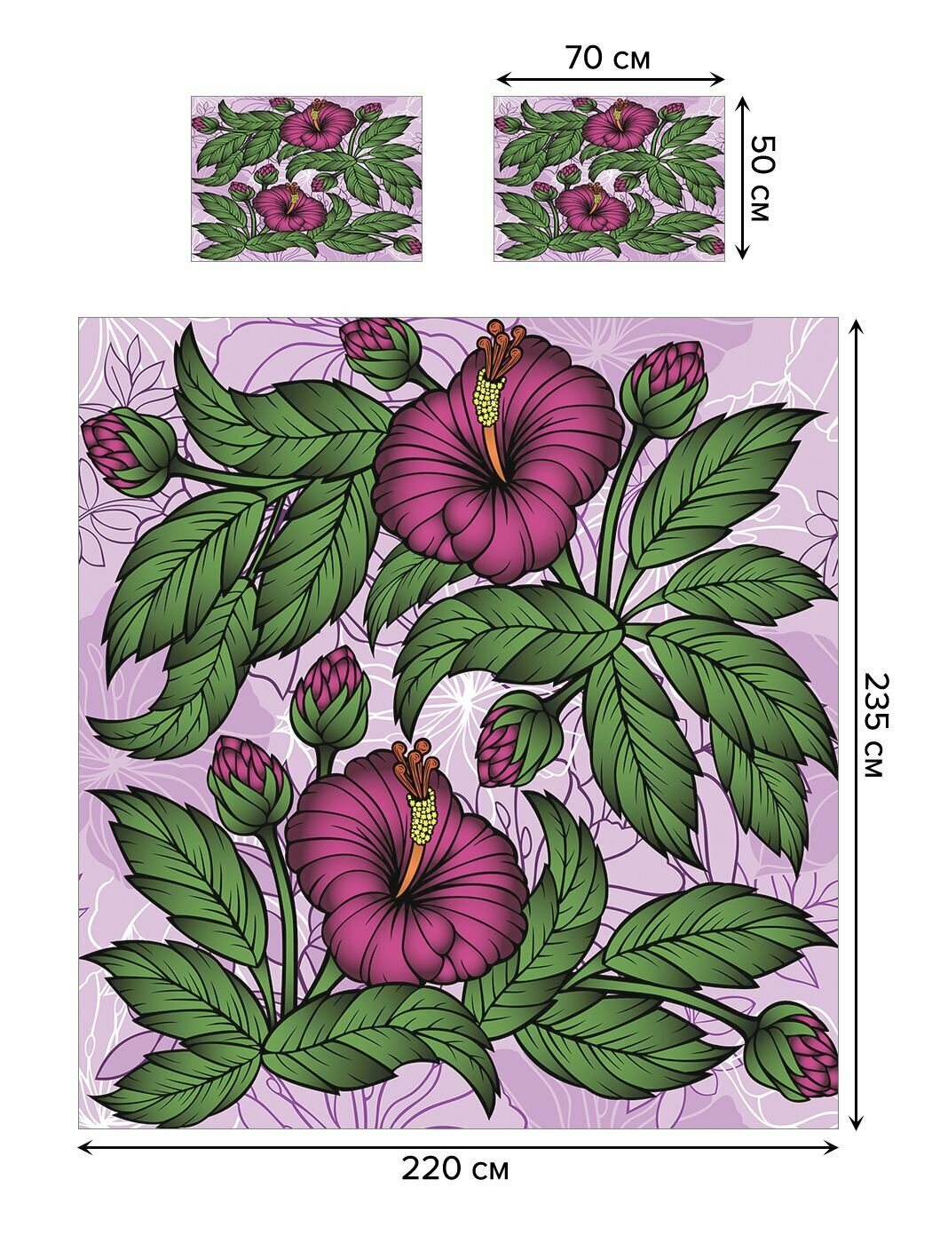 Комплектация: покрывало 220х235 см (2х-спальное), наволочки 50х70 см - 2 шт.