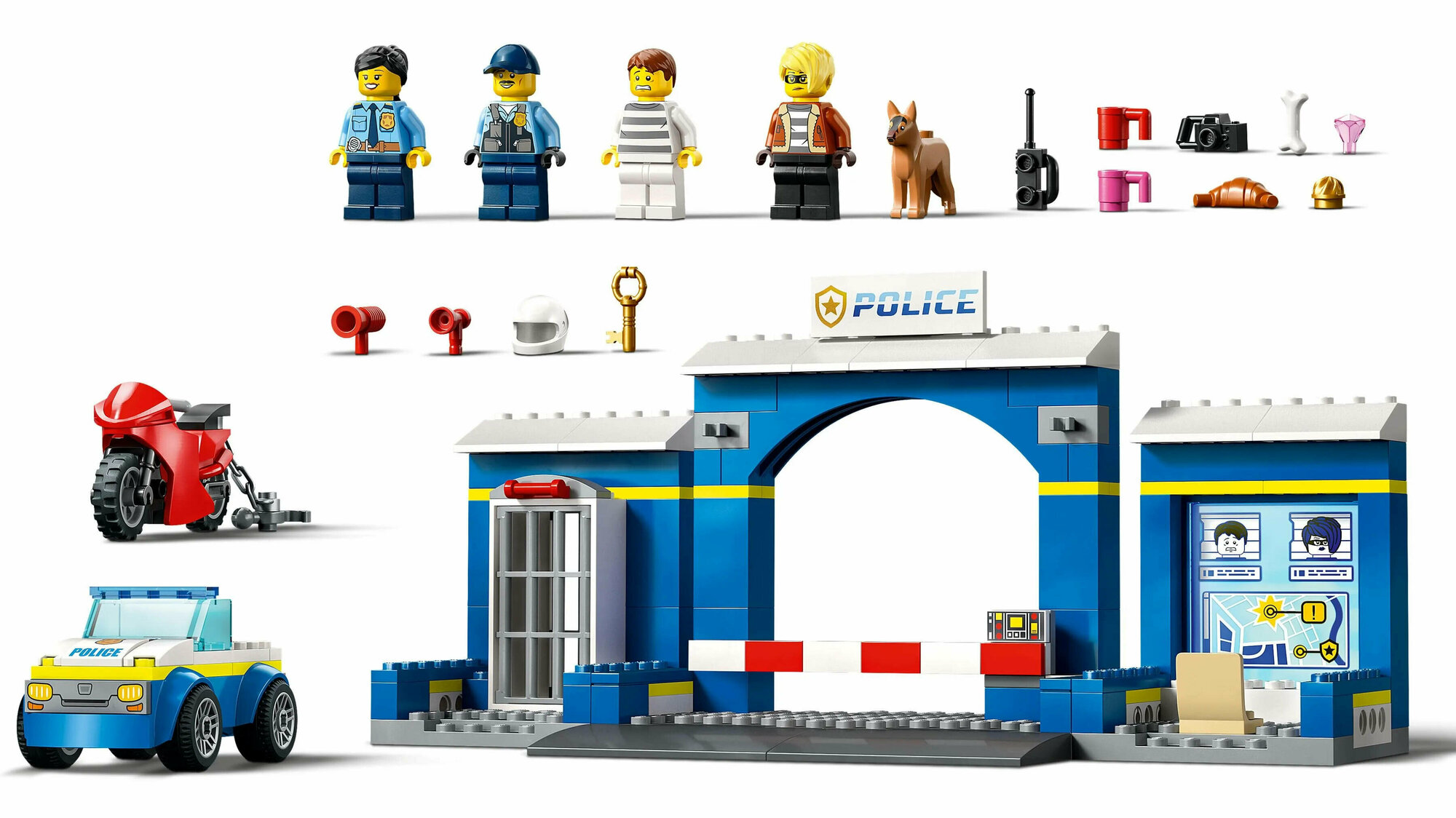 - Включает аксессуары для минифигурок LEGO® — в этот игрушечный полицейский набор входит множество забавных аксессуаров для творческих игр, в том числе игрушечный драгоценный камень, полицейское радио, ключ от тюрьмы, 2 чашки и мегафон.