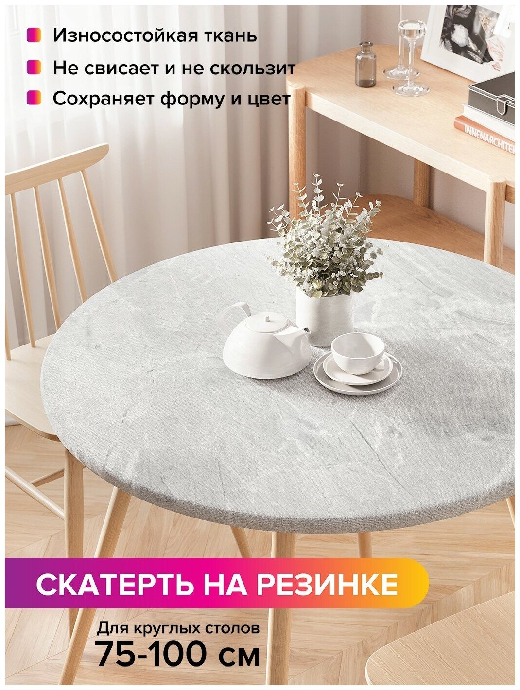 Круглая скатерть с принтом станет стильным аксессуаром на вашей кухни и подойдет не только для ежедневного пользования, но и для встречи гостей и семейных праздников. Благодаря резинке, расположенной по периметру, скатерть не скользит по поверхности стола и надежно фиксируется на круглый стол диаметром 75-100 см.