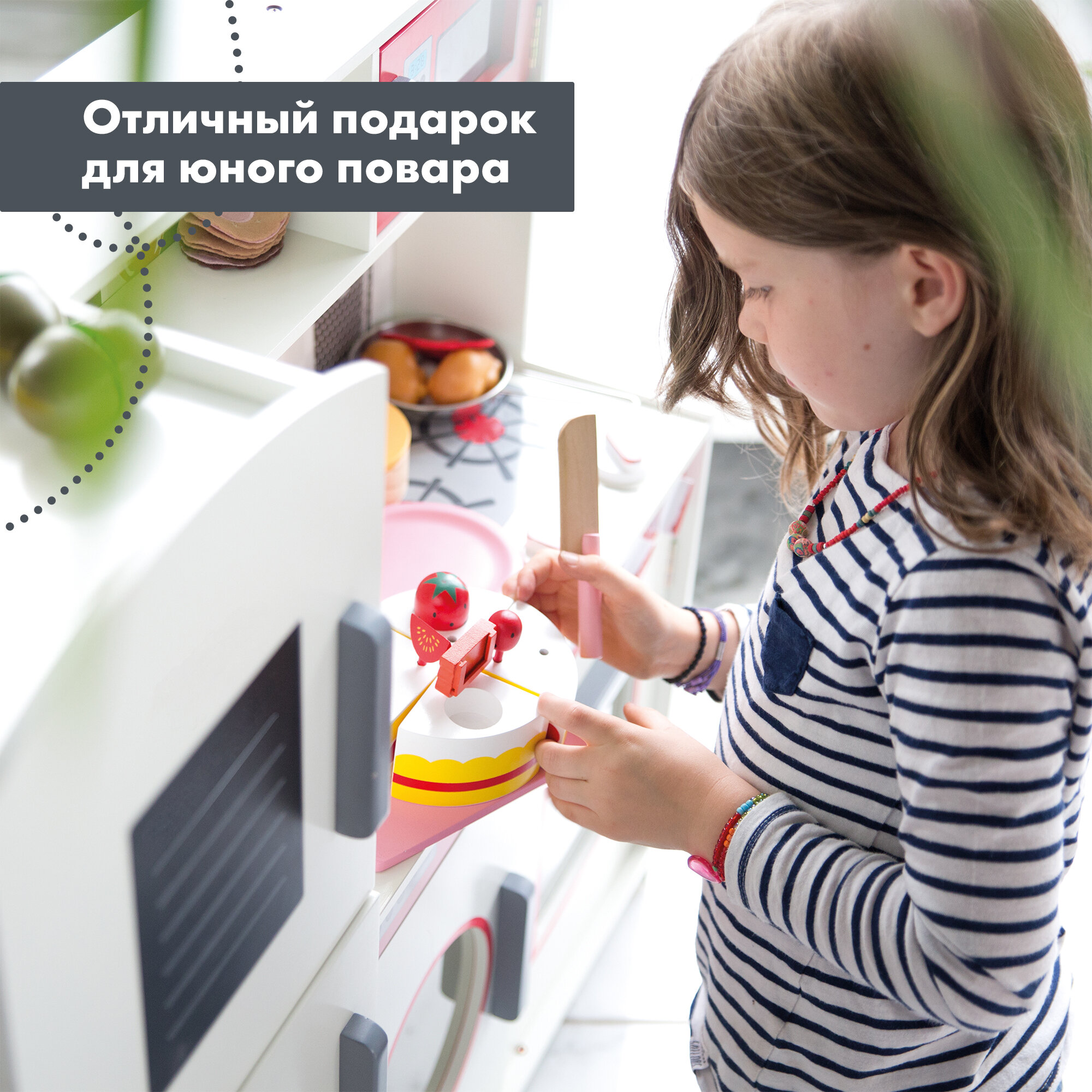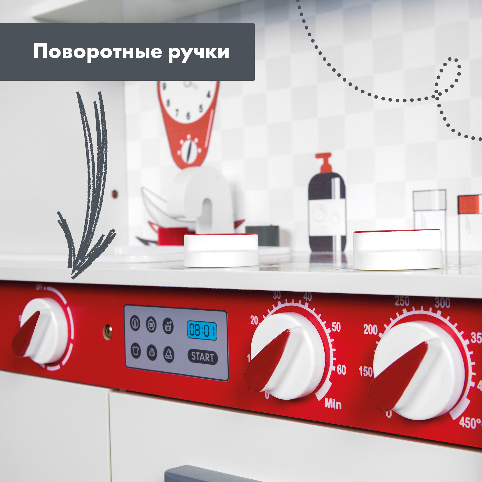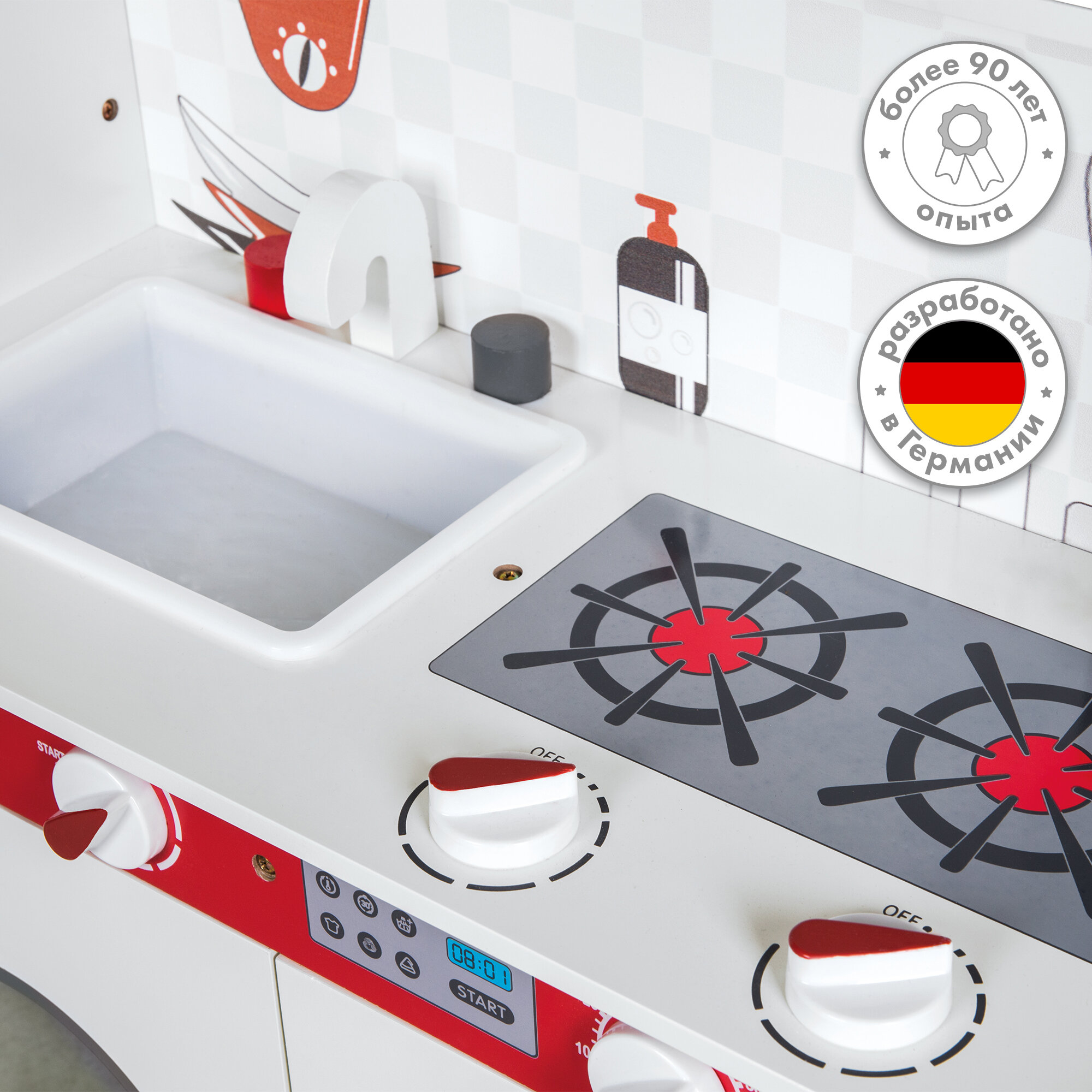 Деревянная детская кухня оснащена:плитой с 2 печатными плитами, духовкой с дверцей, стиральной машиной, морозильной камерой, холодильником с 2 дверцами, доской для записей, микроволновой печью, раковиной с краном, а также 2 декоративные ручки, 5 поворотных ручек для плиты, духовки и стиральной машины. Прозрачные окошки на кухонных приборах гарантируют реалистичное развлечение.