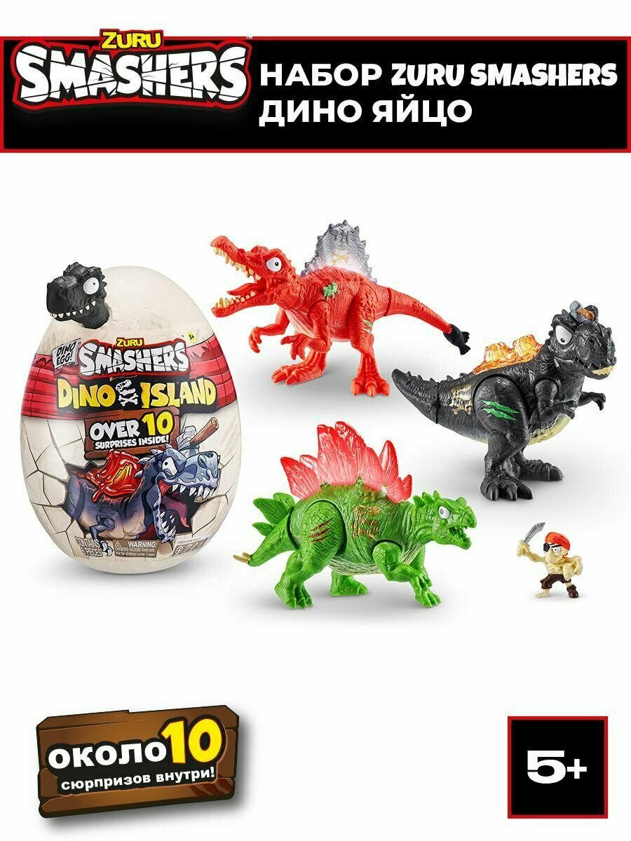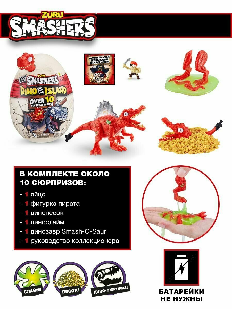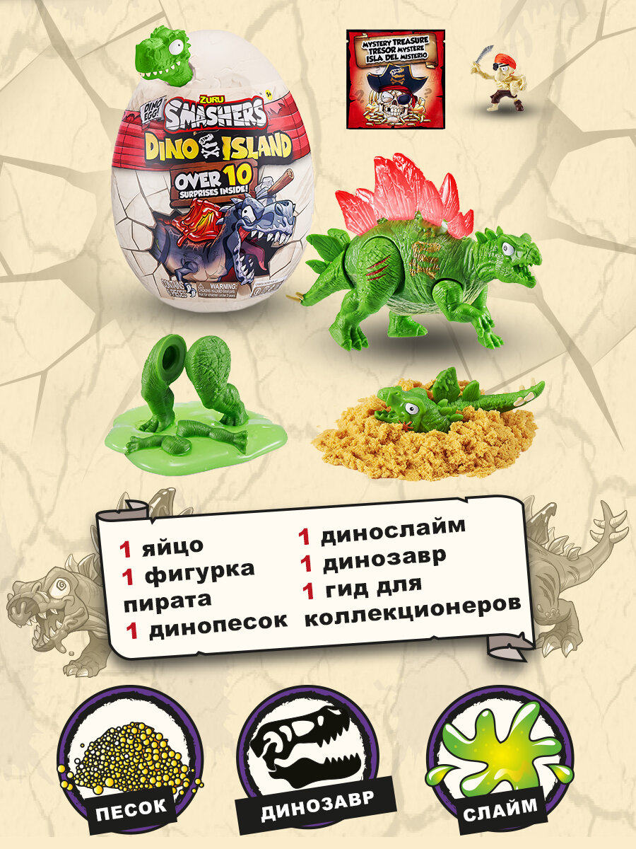 Разбейте яйцо Smashers Dino Island Egg, чтобы попасть в настоящее доисторическое приключение. Чем больше осколков, тем выше шанс обнаружить 10 скрытых сюрпризов внутри этого таинственного яйца. Ищите среди хлюпающего песка и суперрастяжимого слайма свои фигурки Дино. Следите, чтобы назойливый пират не застал вас врасплох. Найдёте ли вы могучего Ти - Рекса, грозного Спинозавра или скрытного Стегозавра? Чего же вы ждёте!? Откройте для себя нового опасного дино из Smashers.