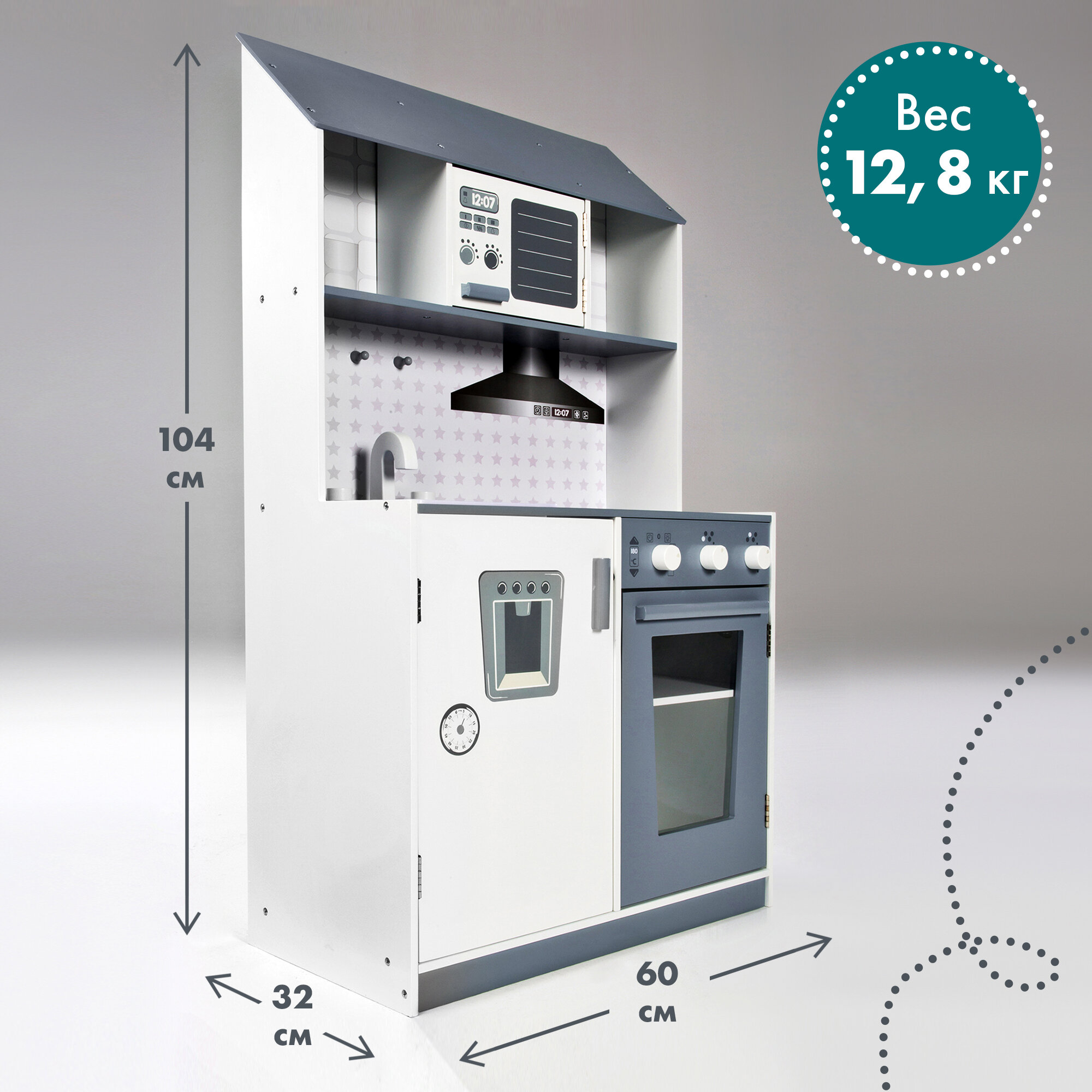 Игровая кухня с большим количеством деталей: над двумя конфорками и грилем изображена вытяжка, а на дверце холодильника – диспенсер для напитков. Два отсека для хранения рядом со встроенной микроволновой печью и холодильником предназначены для хранения продуктов или кухонных принадлежностей. Конфорки и духовку с дверцей можно регулировать с помощью трех поворотных ручек.
