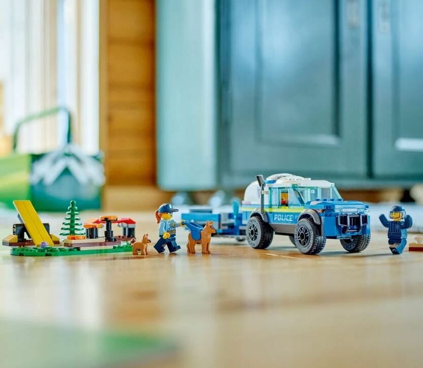 Поклонникам собак понравится этот набор, включающий игрушечный внедорожник, прицеп, 3 обучающих задания, 2 минифигурки, а также фигурки собаки и щенка.