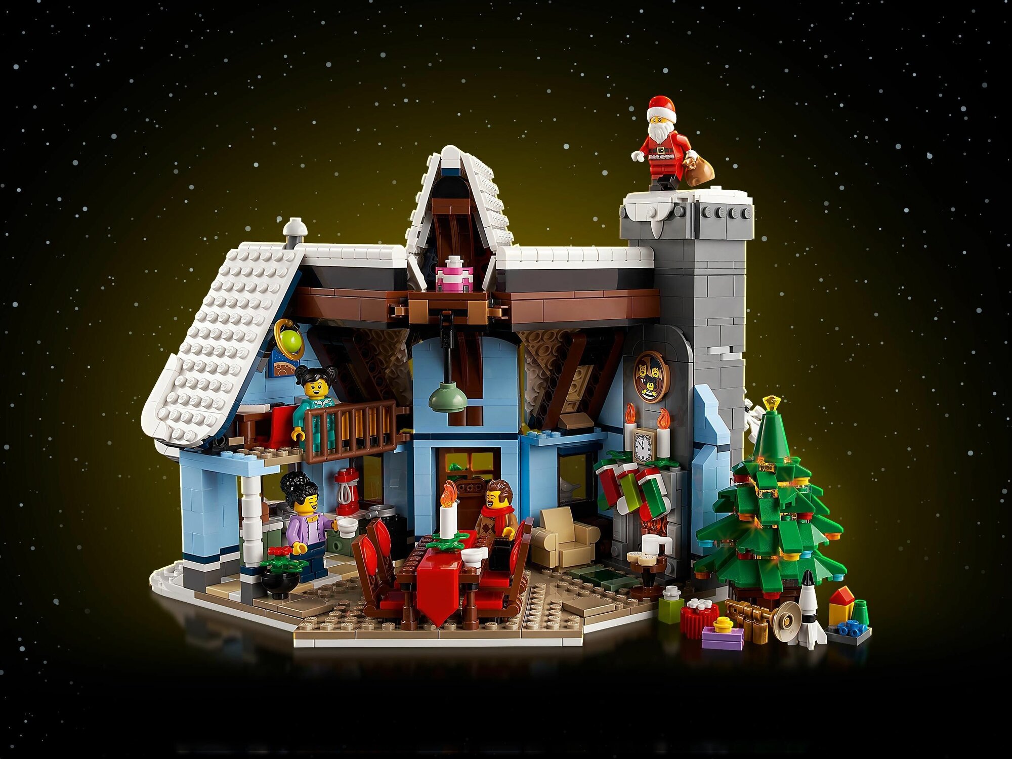 В набор входят четыре минифигурки: папа, мама, дочка и Санта. Вы сможете воссоздать множество уютных семейных сцен на сочельник — посмотрите, как Санта спускается в камин через большой дымоход. Оцените все праздничные детали этого затейливого интерьера: носки на камине, тарелка печенья с молоком для Санты и подарки, спрятанные по всему дому.