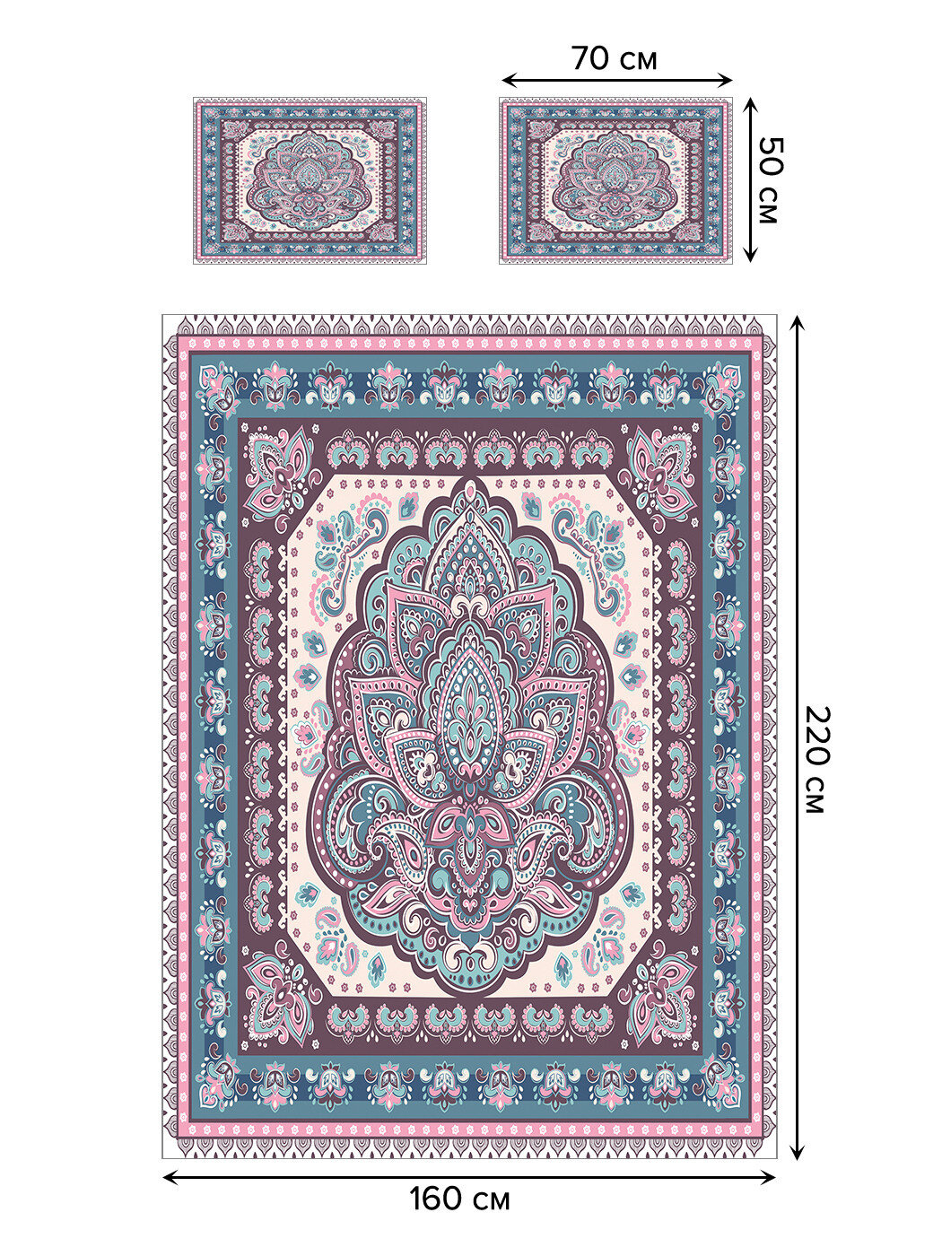 Комплектация: покрывало 160х220 см (1,5-спальное), наволочки 50х70 см - 2 шт.