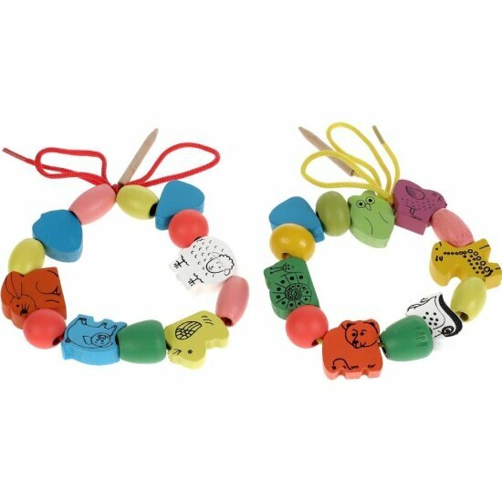 Маленький любознайка будет с удовольствием играть с разноцветными деревянными бусинами разной формы. Малыш научится делать из них яркие бусы, просовывая шнурок в специальное отверстие и чередуя элементы по своему вкусу и желанию.