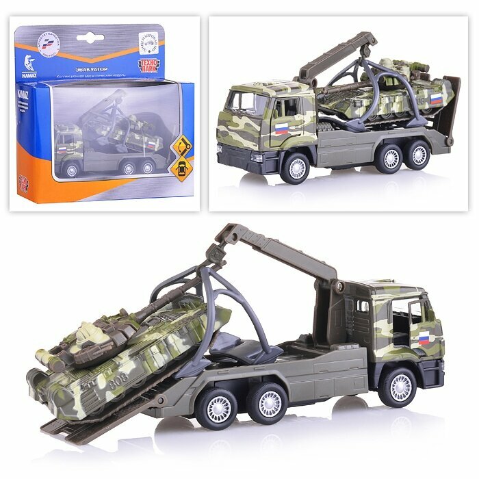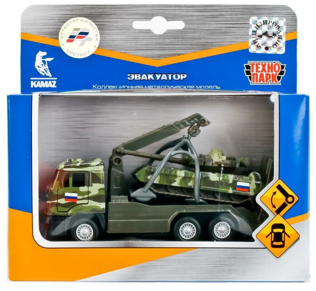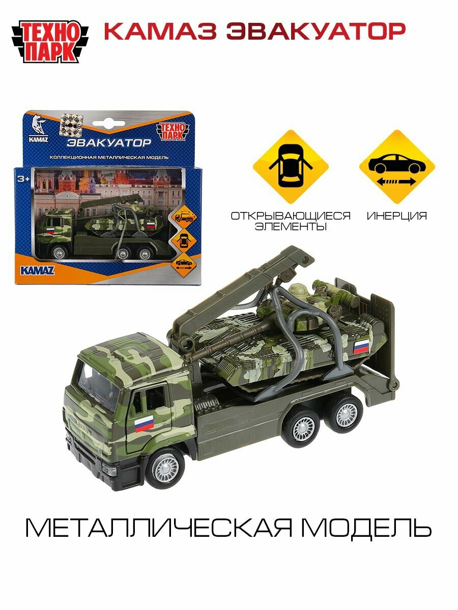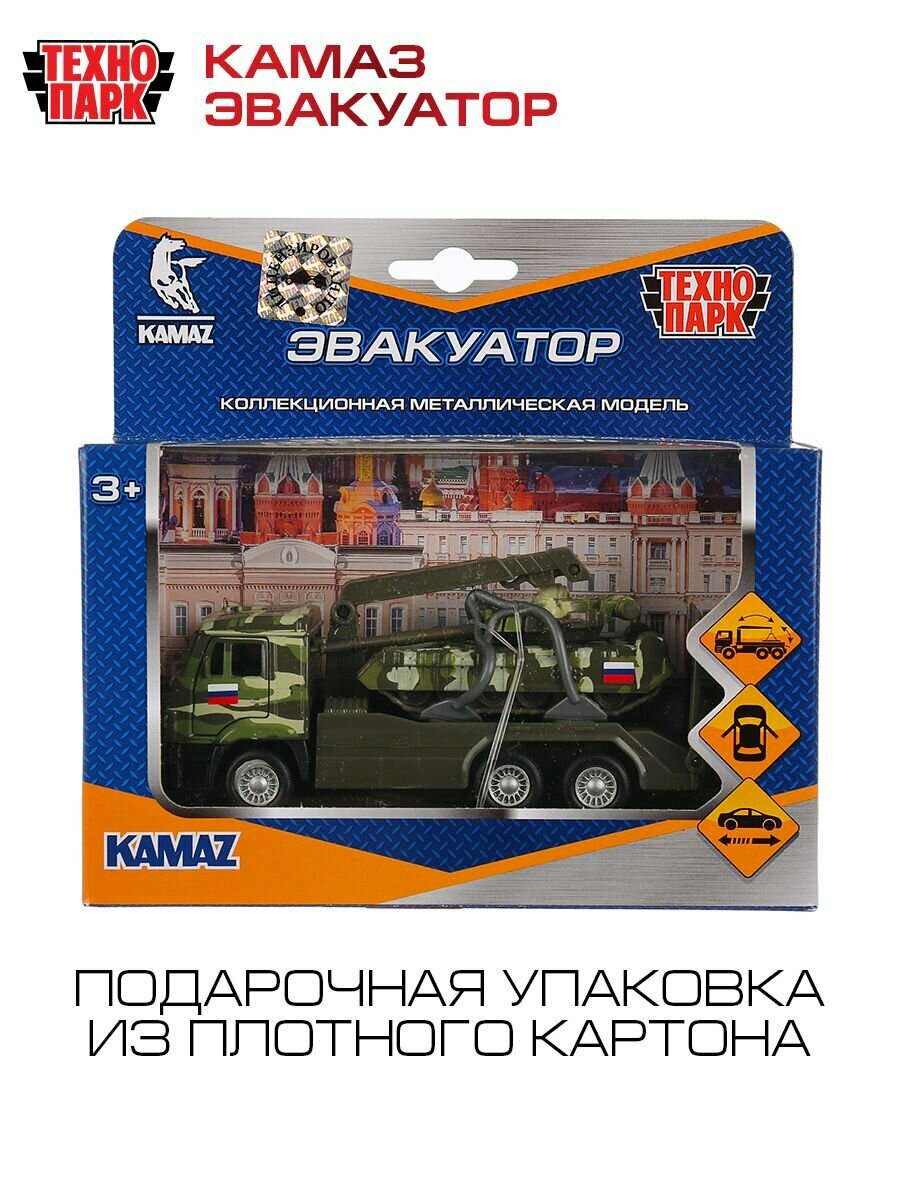 Игрушечный эвакуатор является уменьшенной копией настоящей модели KAMAZ. Он выполнен в военном цвете хаки, оснащен инерционным механизмом. У кабины открываются двери, что позволяет почувствовать реалистичность машины.