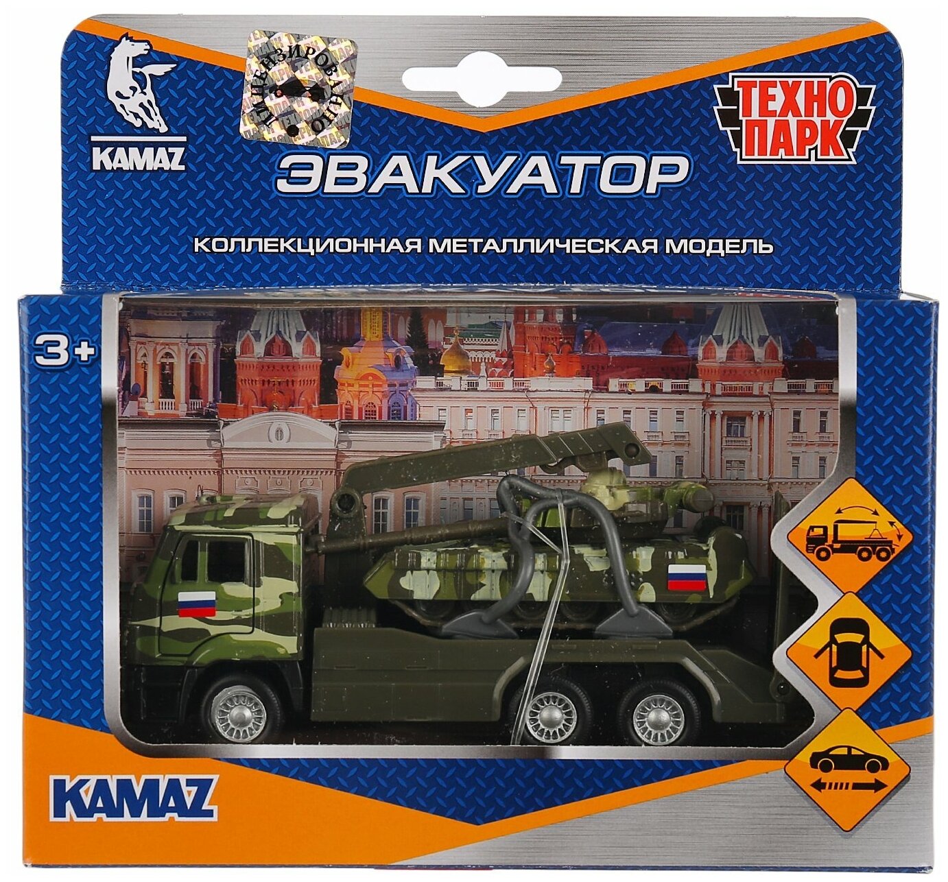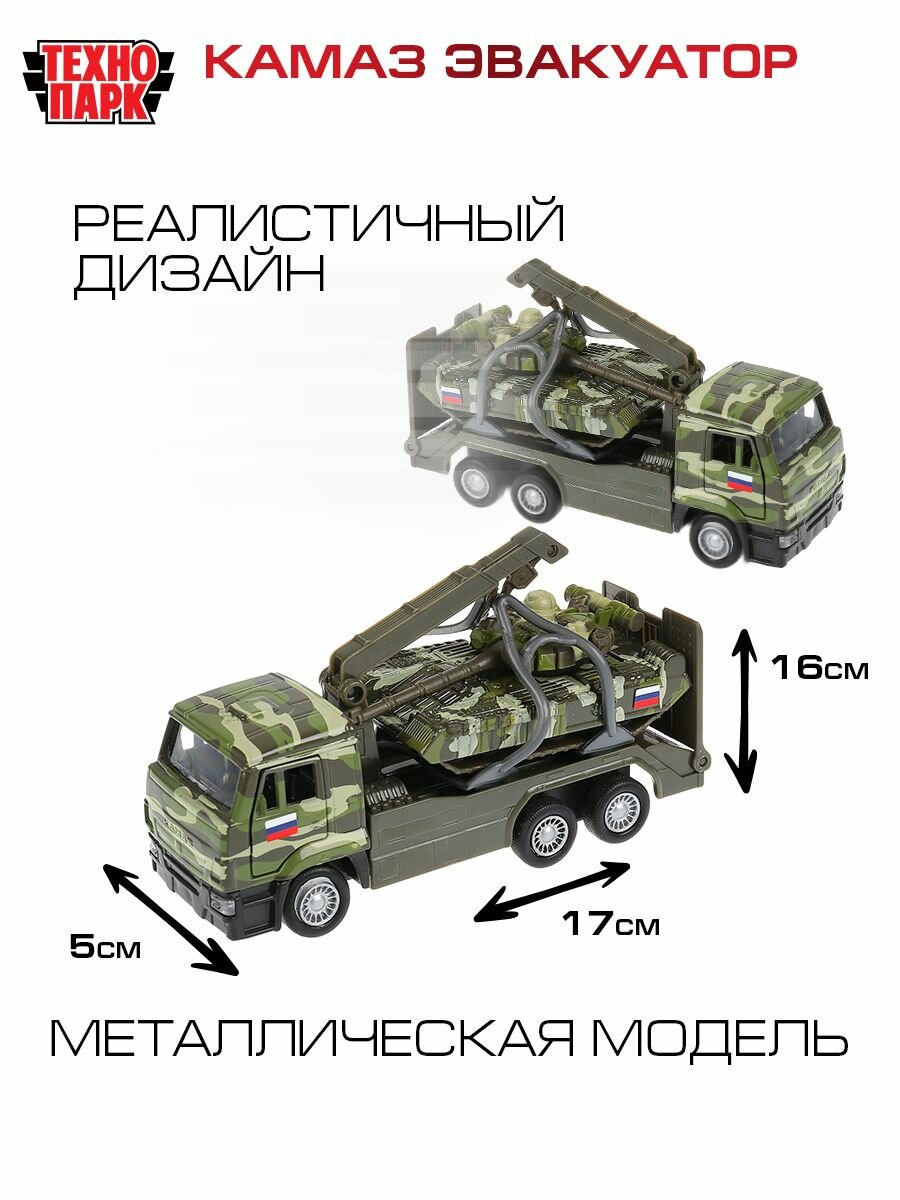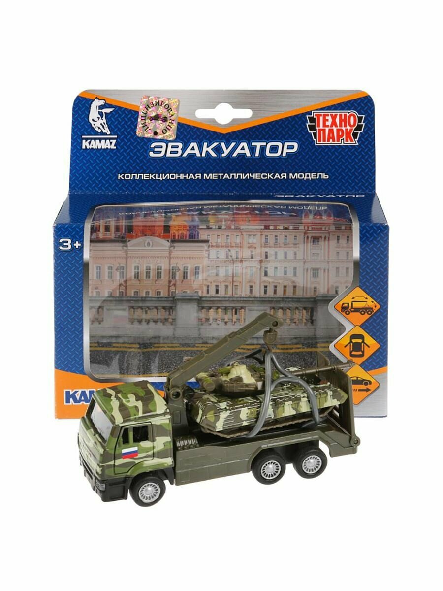 Игрушечный эвакуатор является уменьшенной копией настоящей модели KAMAZ. Он выполнен в военном цвете хаки, оснащен инерционным механизмом. У кабины открываются двери, что позволяет почувствовать реалистичность машины.