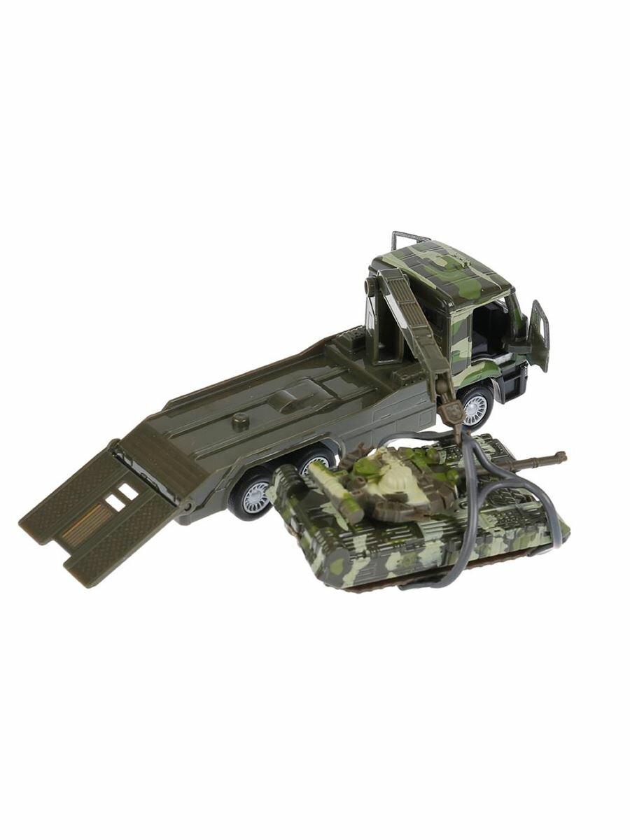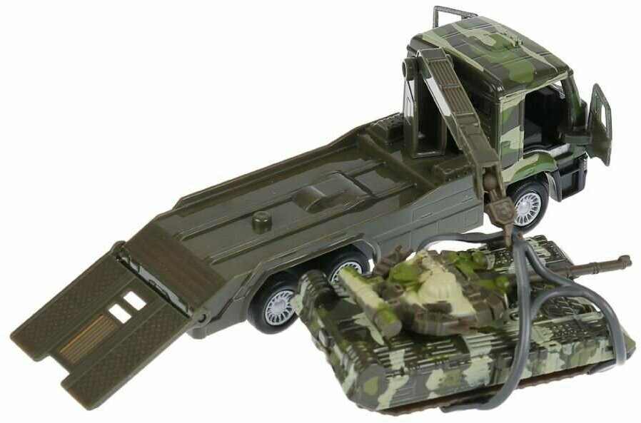 На платформе эвакуатора находится танк, с которым можно играть отдельно. Играя, ребёнок развивает логику, воображение, придумывая различные сюжеты. Рекомендовано детям от 3-х лет.