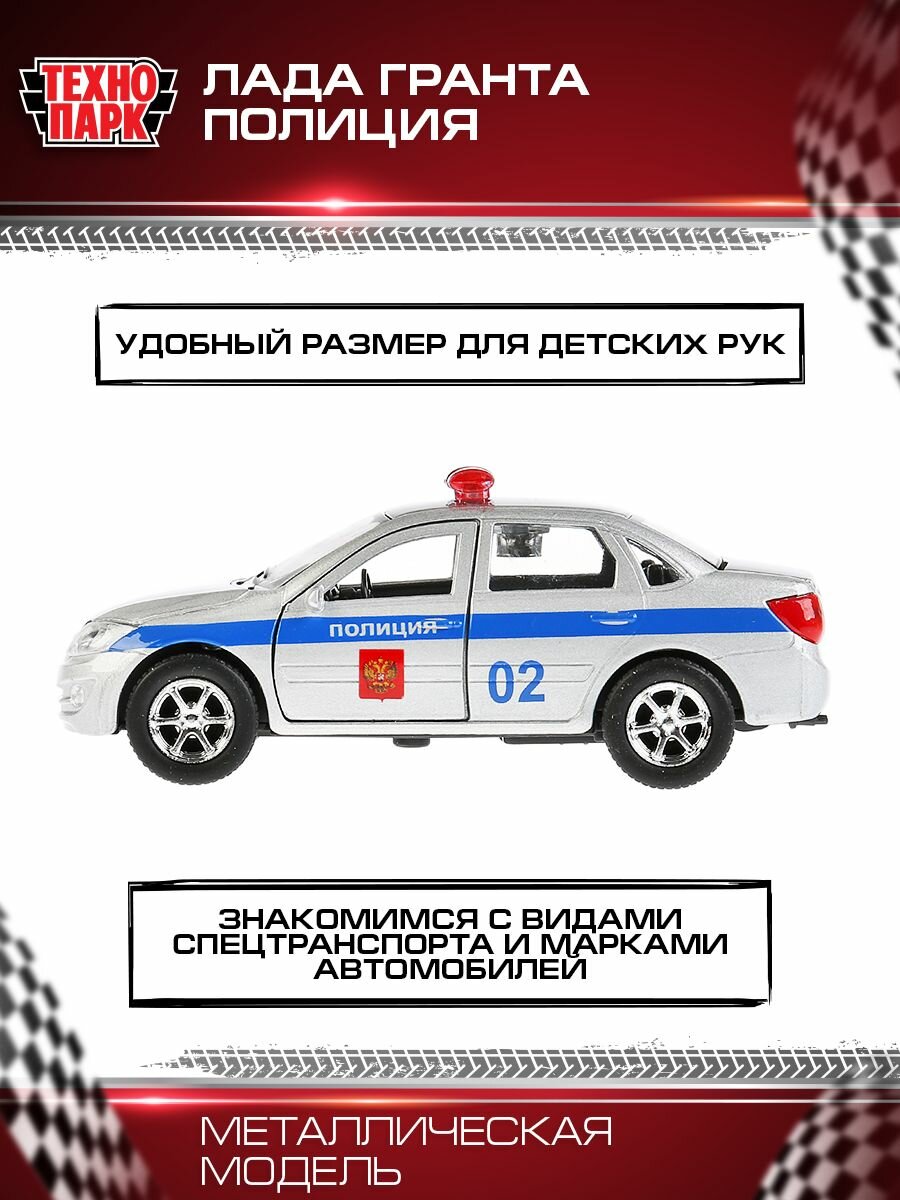 Полицейская машина ЛАДА ГРАНТА – новинка ТМ «Технопарк» – порадует и ребёнка, и коллекционера надписями, свойственными полицейским машинкам, скоростью и функциями 3 в 1: