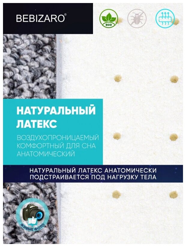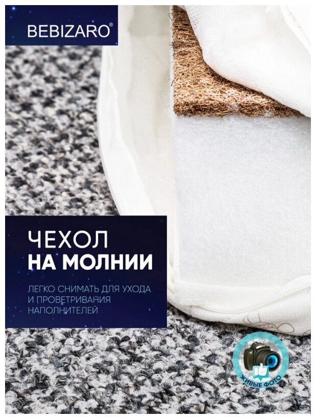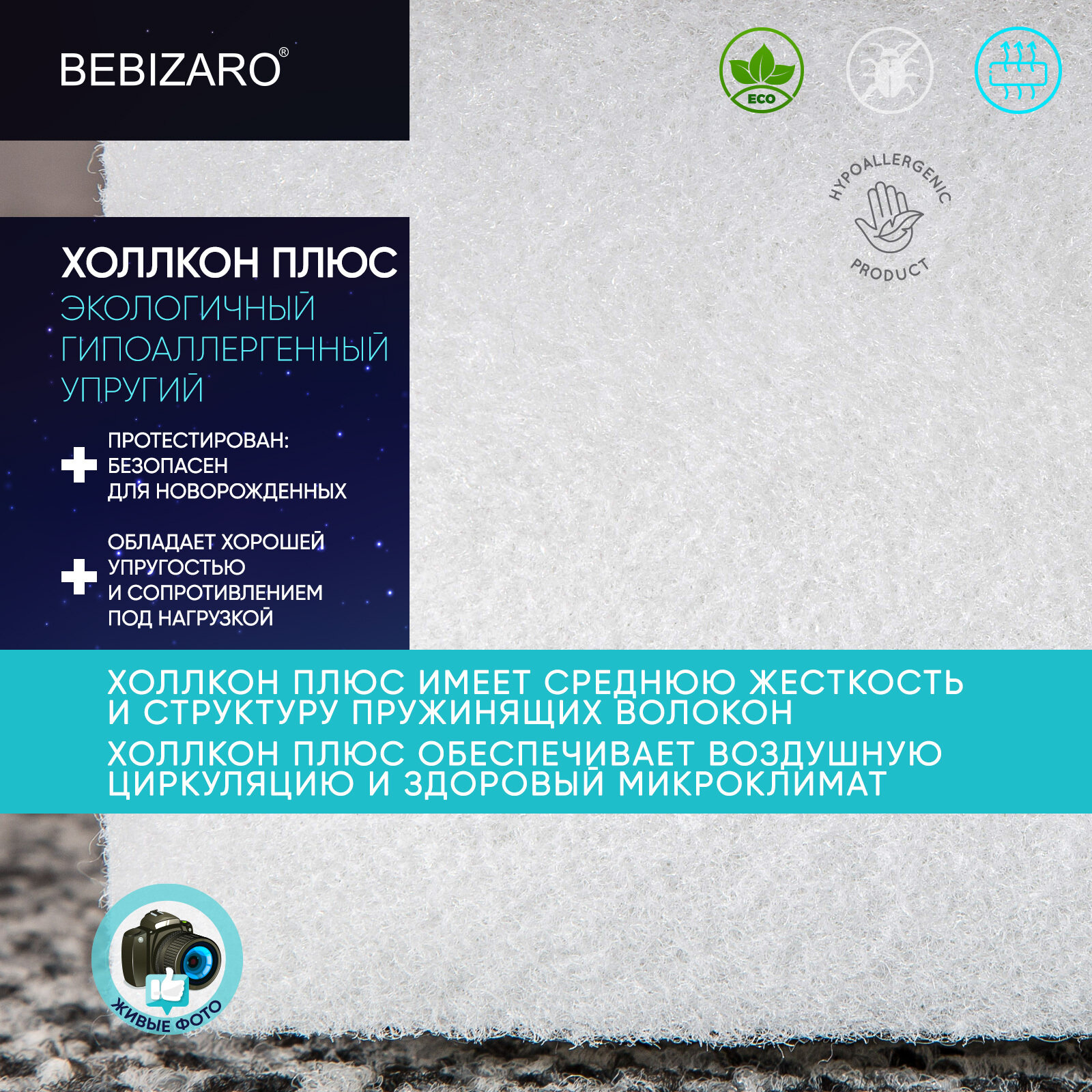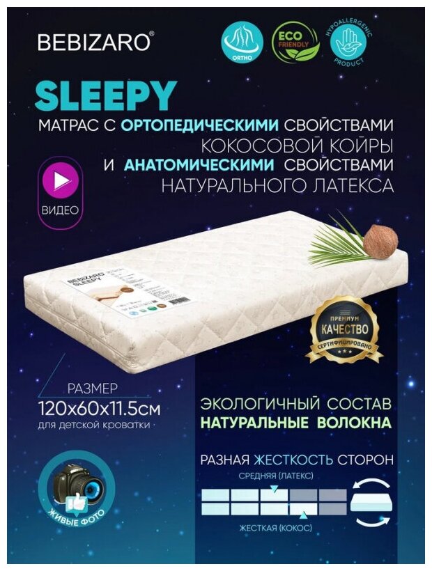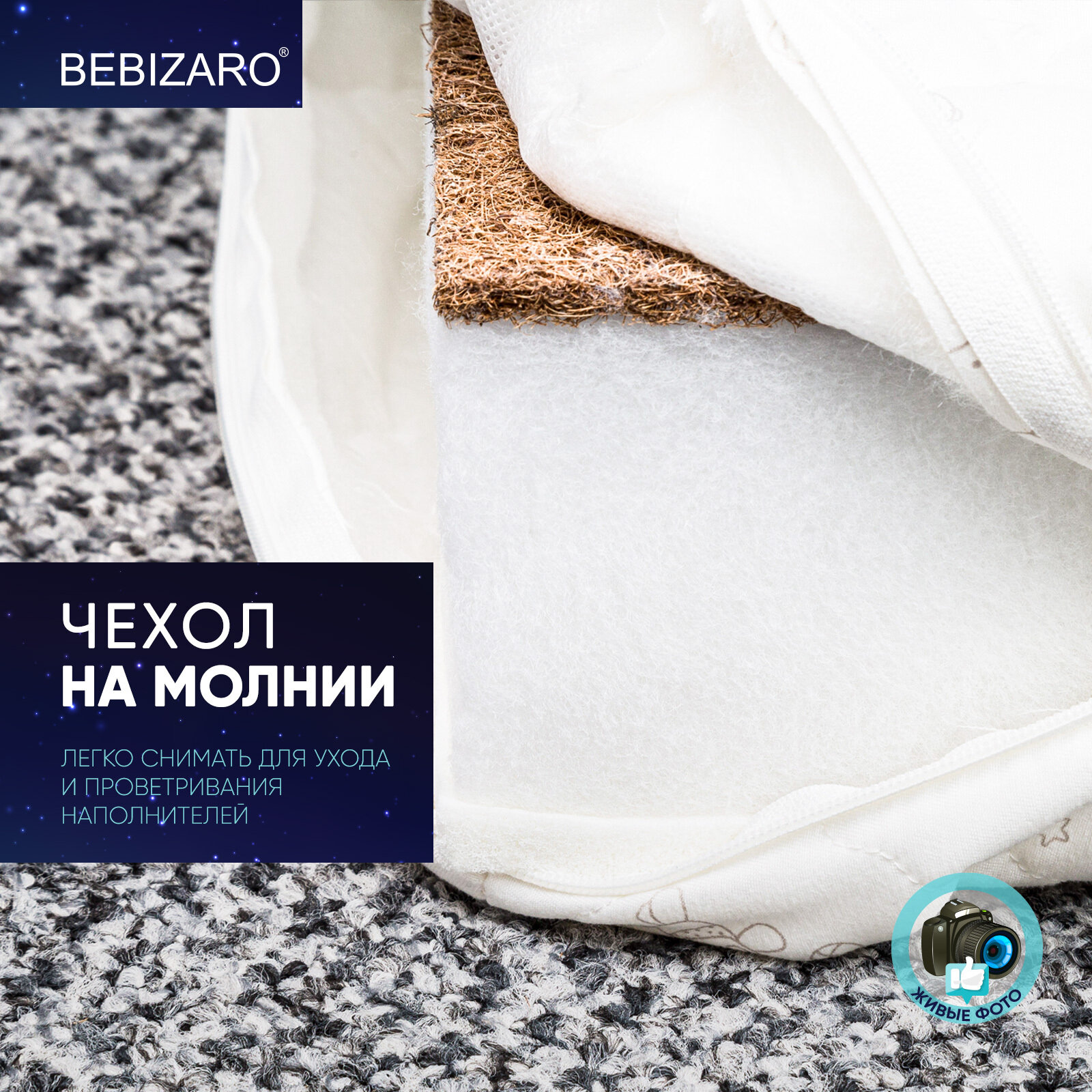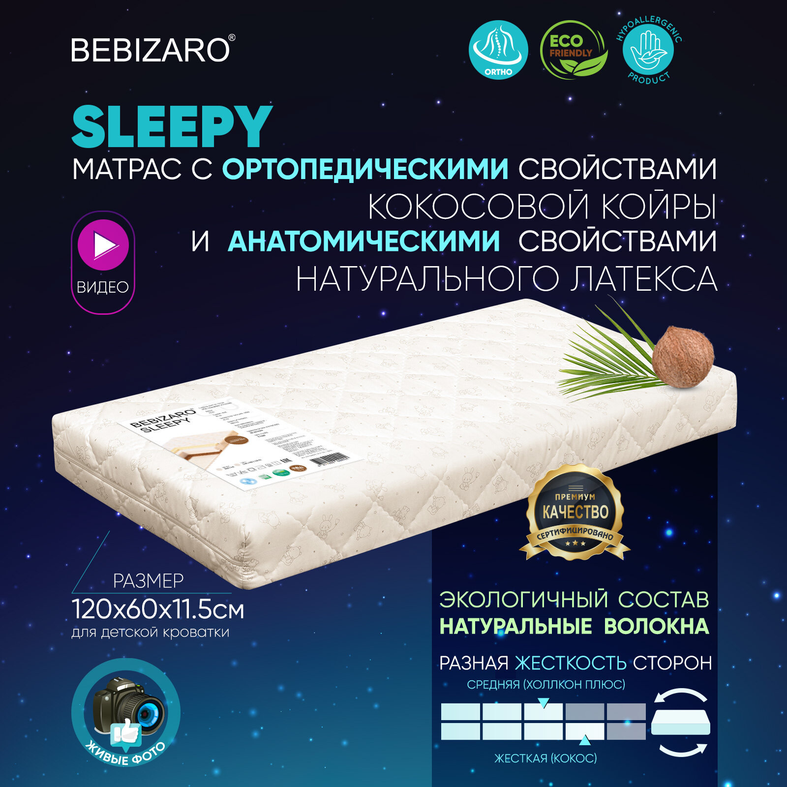 Детский матрас BEBIZARO SLEEPY 120х60х12 см, Ортопедический матрас - имеет две стороны разной жесткости, обеспечивает здоровый и комфортный сон детей от рождения до 3-4 лет. Подходит для кровати со спальным местом 120х60 см. Двусторонний матрас решает сразу две задачи: одна сторона обеспечивает жесткую поддержку позвоночника с самого рождения, а на второй стороне расположены более эластичные материалы для комфортного сна ребенка от 6-ти месяцев.