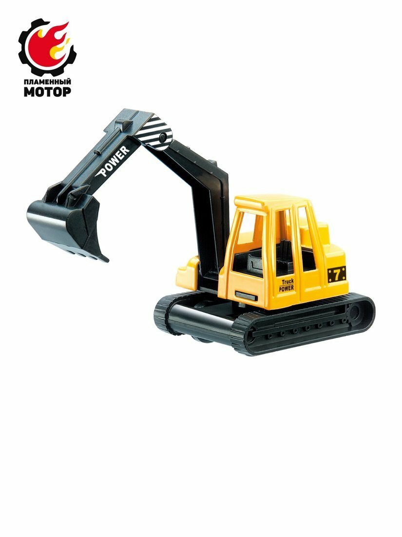 Игрушечный экскаватор из серии «Строительная техника» представлен в жёлтом цвете и акцентирован деталями чёрного цвета (ковш, гусеничная платформа, внутренняя часть кабины).