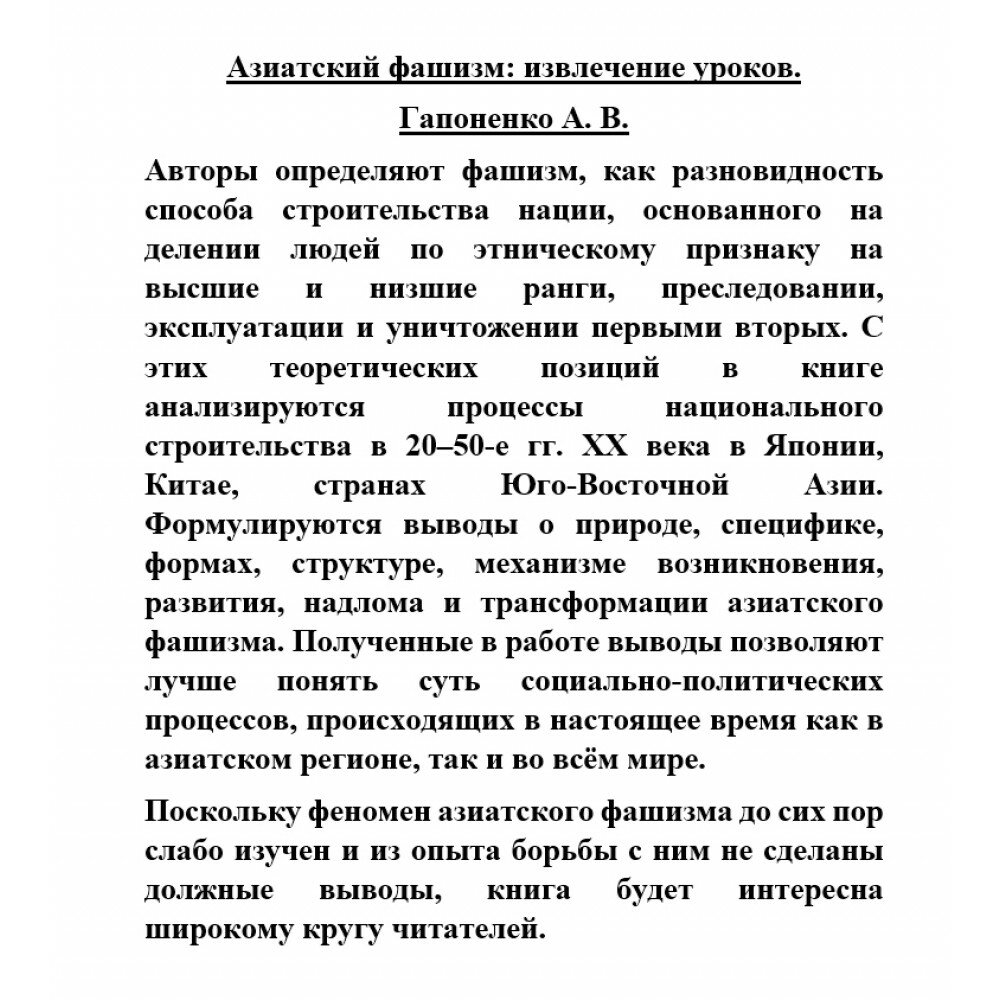 Авторы определяют фашизм, как разновидность способа строительства нации, основанного на делении людей по этническому признаку на высшие и низшие ранги, преследовании, эксплуатации и уничтожении первыми вторых. С этих теоретических позиций в книге анализируются процессы национального строительства в 20-50-е гг. XX века в Японии, Китае, странах Юго-Восточной Азии. Формулируются выводы о природе, специфике, формах, структуре, механизме возникновения, развития, надлома и трансформации азиатского фашизма. Полученные в работе выводы позволяют лучше понять суть социально-политических процессов, происходящих в настоящее время как в азиатском регионе, так и во всём мире.