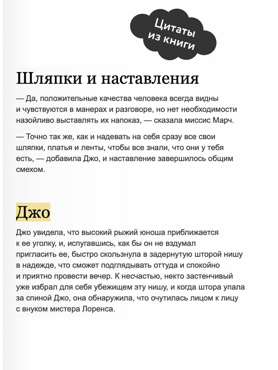 Приятное и доброе произведение. Привлекло после просмотра экранизированной адаптации книги, к которой приступила сразу же, после приобретения. На протяжении всего знакомства основным сюжетом, главные героини всё сильнее закреплялись, как не только хорошо прописанные и продуманные персонажи, но и живые люди, что выводят читателя на собственные сюжетные линии и заставляют больше проникнуться к их личной истории. Вместе с ними мы переживаем проблемы, большинство из которых актуальны и по сей день. Советую книгу к прочтению, особенно во времена холодной и серой осени.