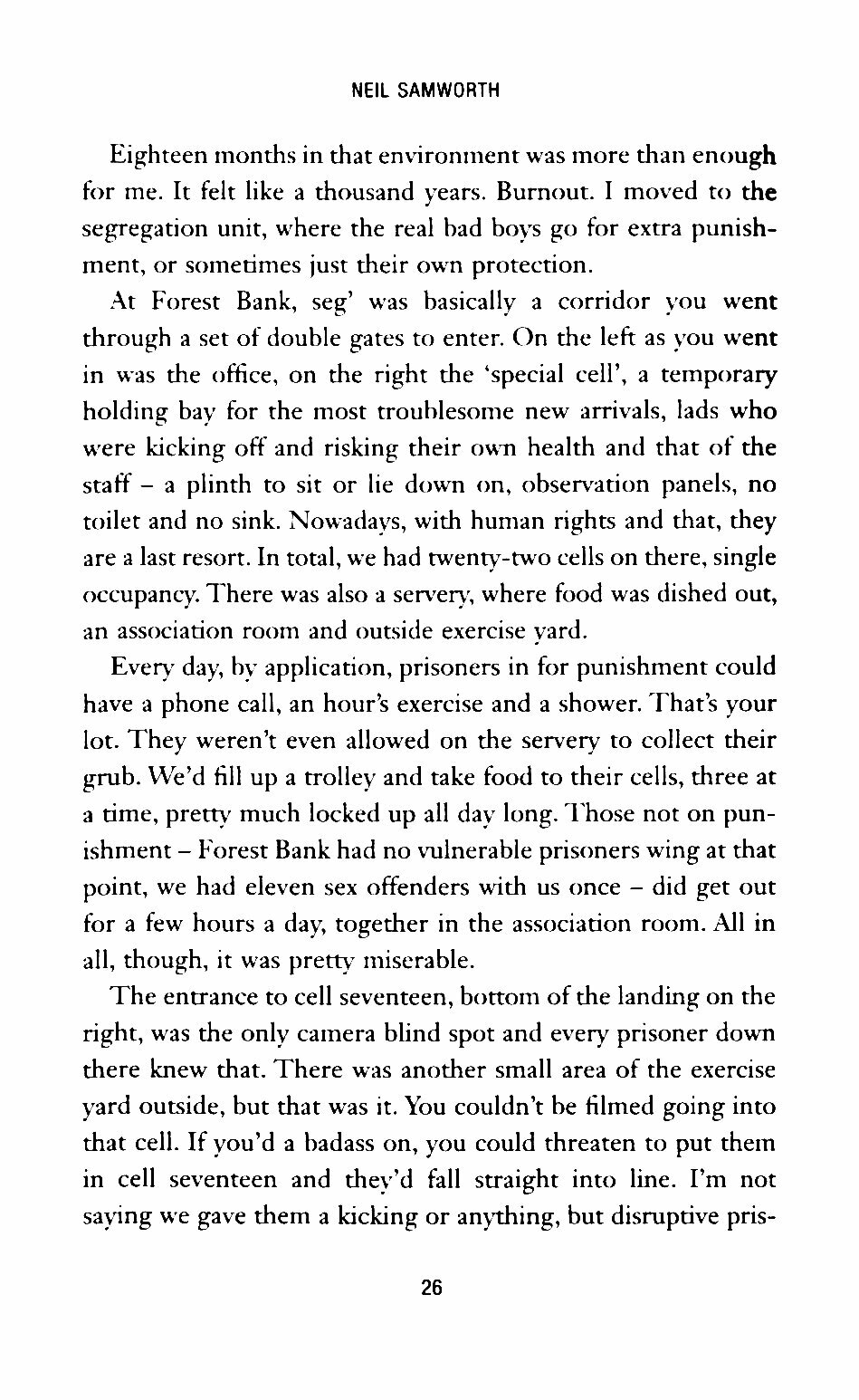 Neil 'Sam' Samworth spent eleven years working as a prison officer in HMP Manchester, aka Strangeways. A tough Yorkshireman with a soft heart, Sam had to deal with it all - gangsters and gangbangers, terrorists and psychopaths, addicts and the mentally ill. Men who should not be locked up and men who should never be let out. He tackles cell fires and self-harmers, and goes head to head with some of the most dangerous men in the country. He describes being attacked by prisoners, and reveals the problems caused by radicalization and the drugs flooding our prisons.