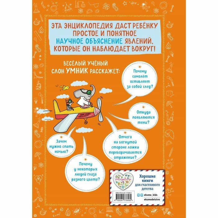 Эта компактная энциклопедия для детей содержит ответы на все самые интересные вопросы о науке! Весёлый слон Умник раскроет любознательному ребёнку удивительные тайны окружающего мира и с помощью наглядных опытов объяснит, почему бывает дождь, как готовится еда в микроволновке, куда ночью уходит солнце и как происходят другие явления. Фишки книги: спроси слона (на все детские вопросы отвечает учёный слон Умник); проведи несложные, безопасные и понятные эксперименты; познакомься раньше ровесников со списком «продвинутых» слов для запоминания! А узнать о мире животных поможет детская книга этой же серии «Знаю больше всех про всё о ПРИРОДЕ». Проведите совместный с ребёнком досуг дома, на прогулке или в поездке с удовольствием и пользой! Энциклопедия предназначена для детей младшего школьного возраста.