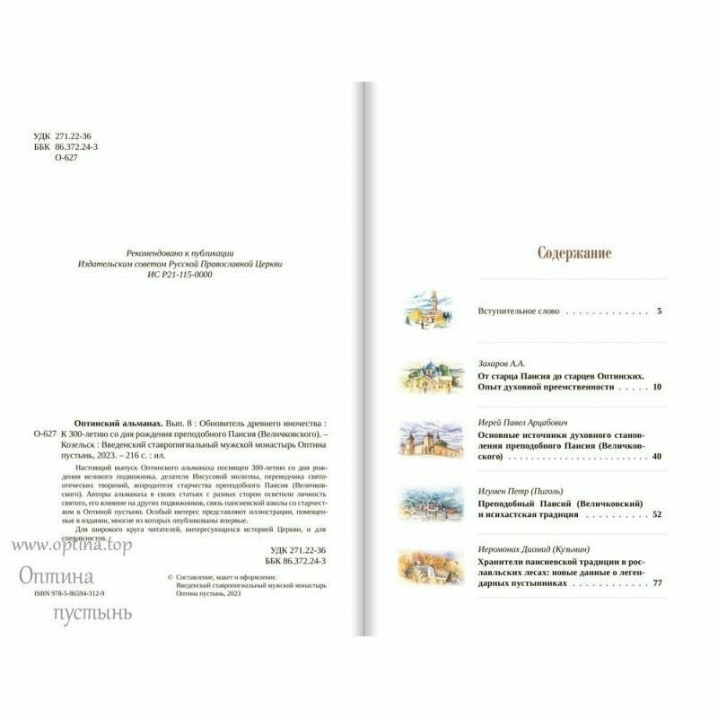 Настоящий выпуск Оптинского альманаха посвящен 300-летию со дня рождения великого подвижника, делателя Иисусовой молитвы, переводчика святоотеческих творений, возродителя старчества преподобного Паисия (Величковского). Авторы альманаха в своих статьях с разных сторон осветили личность святого, его влияние на других подвижников, связь паисиевской школы со старчеством в Оптиной пустыни. Особый интерес представляют иллюстрации, помещенные в издании, многие из которых опубликованы впервые.