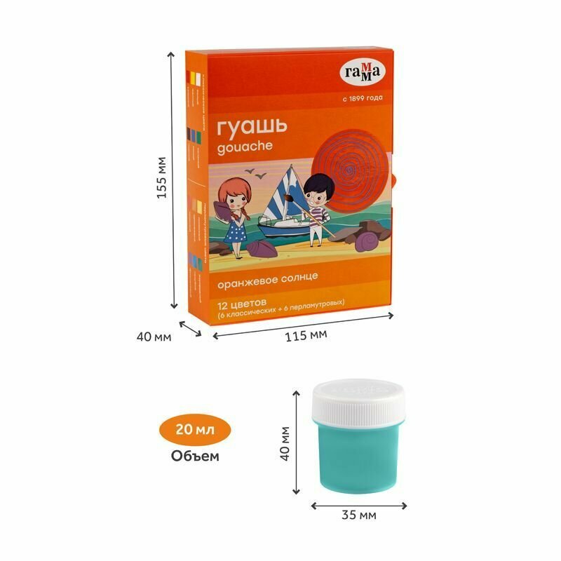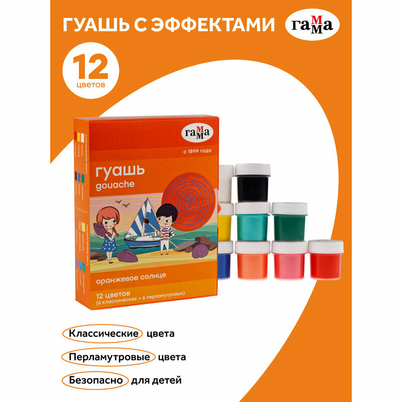 Гуашь Оранжевое солнце 12 цветов 6 перламутровых 6 классических ГАММА