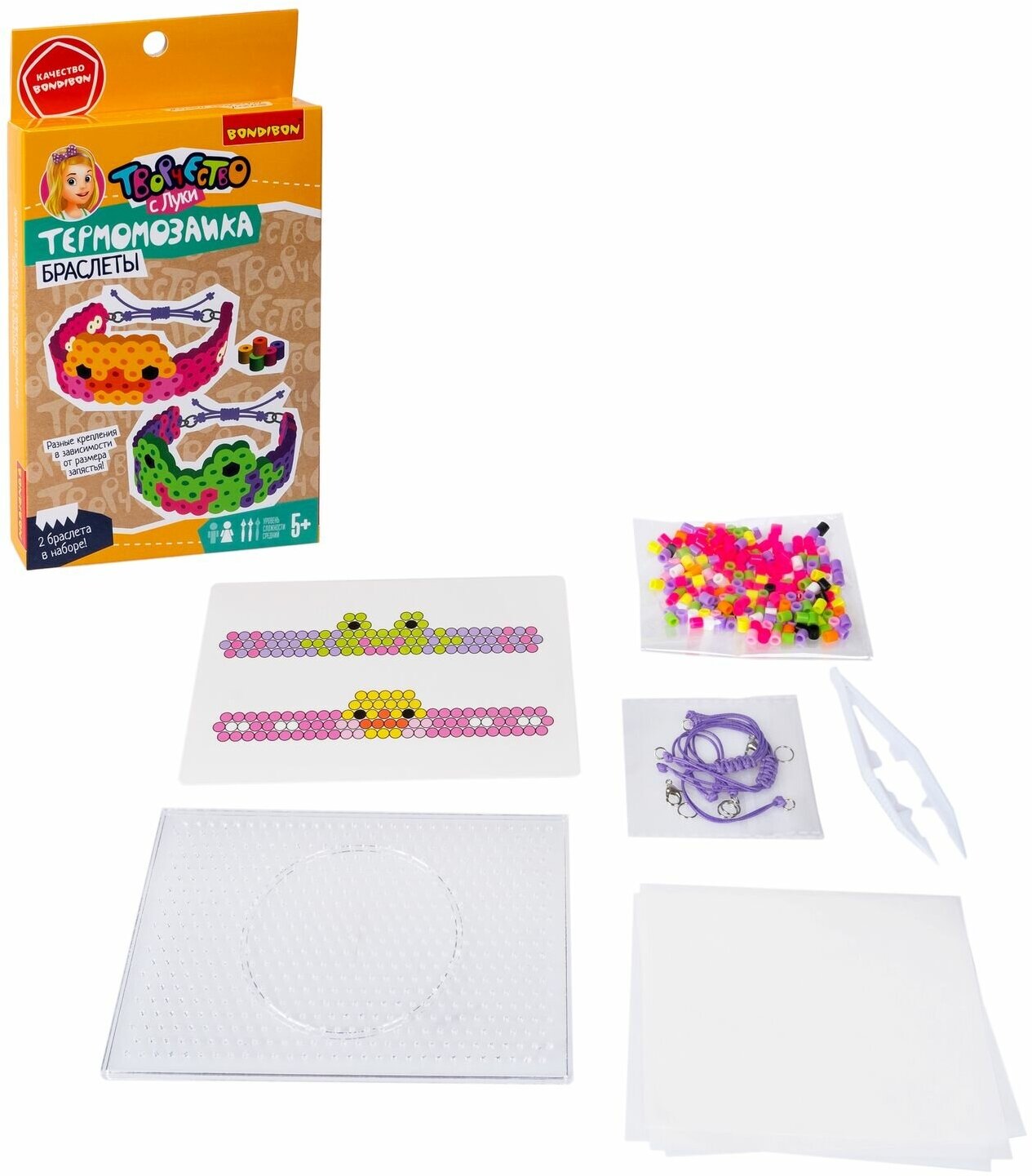 Малыши придут в восторг от ярких украшений из бусин, сделанных своими руками! Bondibon представляет набор для творчества термомозаика лягушка и уточка для создания двух браслетов из серии Творчество с Луки.