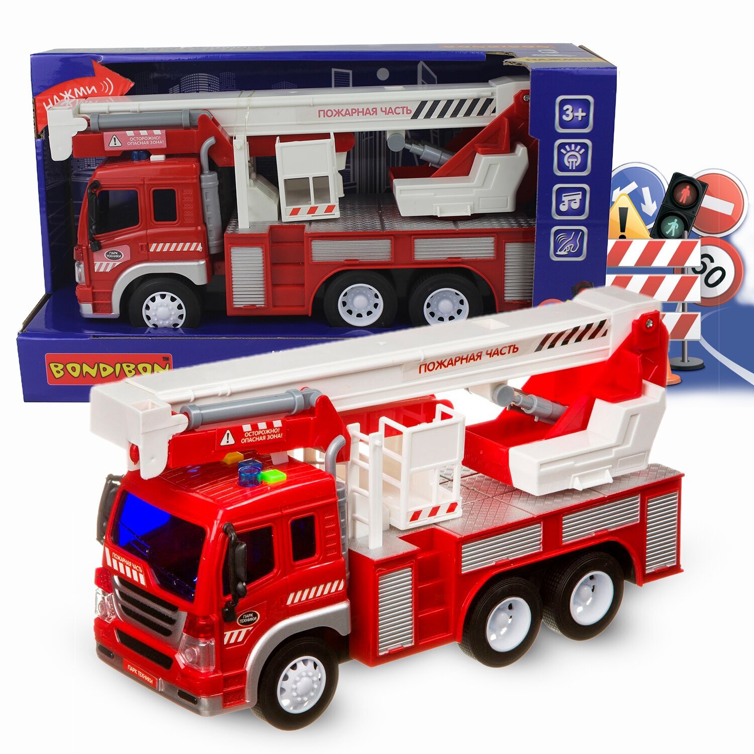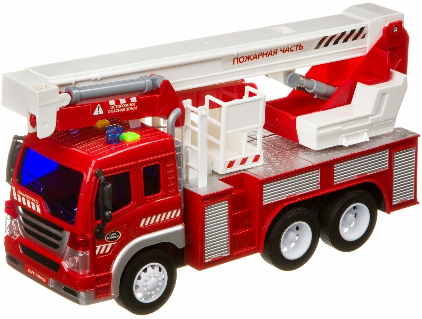 Прекрасно детализированный кузов, прочные прорезиненные колеса, инерционный механизм, широкий ассортимент специализированных автомобилей - все это отличает серию автомобилей "Парк техники". Пожарная машина со светом и звуком обладает функциональным кузовом и выглядит совсем как настоящая! Игрушка может двигаться самостоятельно, если поставить ее на ровную поверхность и оттянуть назад (инерционный механизм).