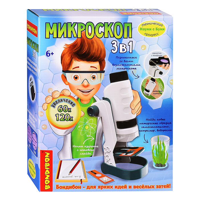 Французские опыты Науки с Буки. Микроскоп 3 в 1 60X120X Bondibon