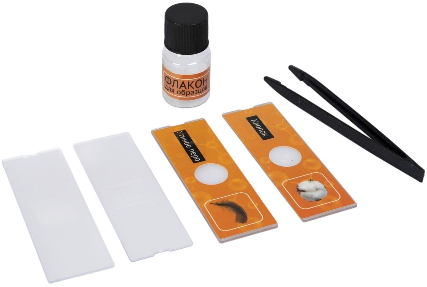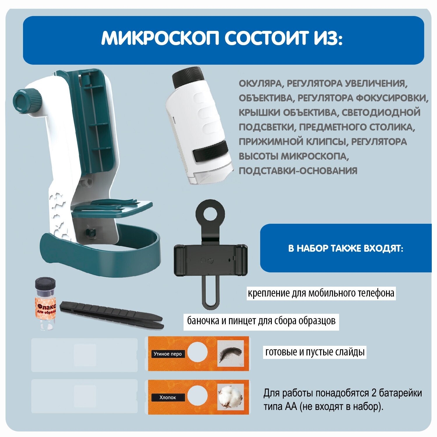 В набор для исследований входят микроскоп, крепление для мобильного телефона, баночка и пинцет для сбора образцов для собственных слайдов, 2 готовых и 2 пустых слайда. Для работы устройства необходима 1 батарейка ААА (не входит в набор).