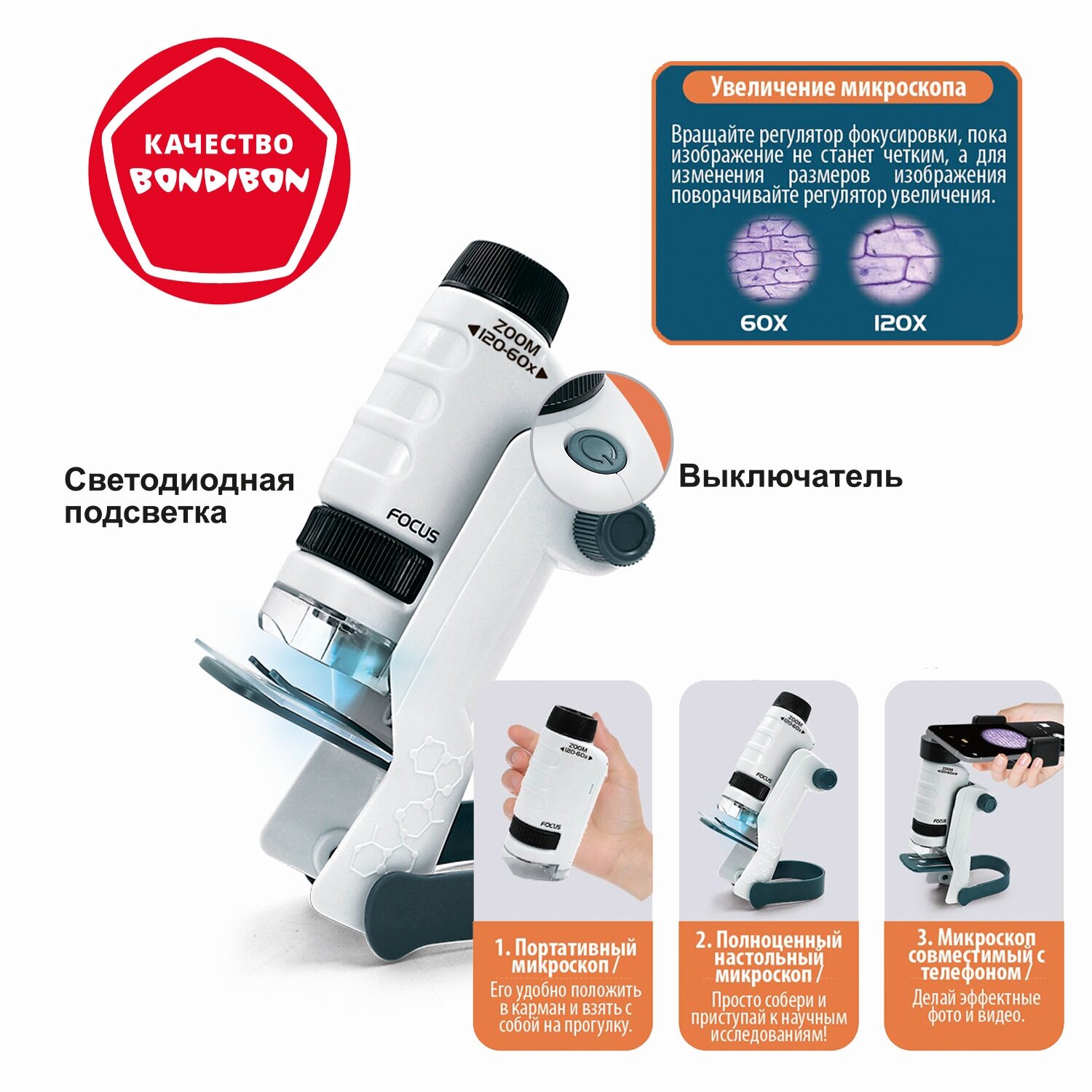 Портативный микроскоп 3в1 ТМ Bondibon подойдет для использований подростку, пригодится школьникам и абитуриентам, станет хорошим подарком на 1 сентября, новый год, день рождения для мальчика или девочки.