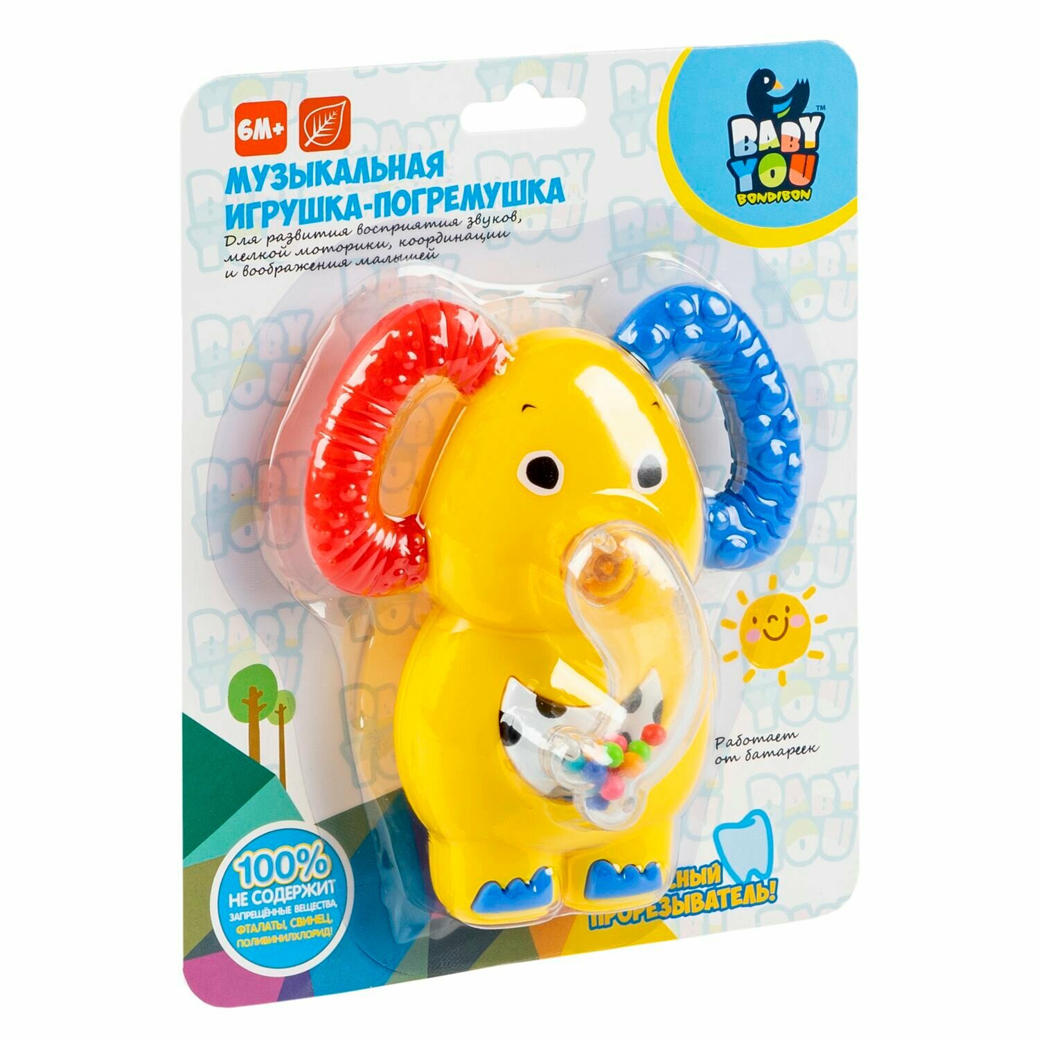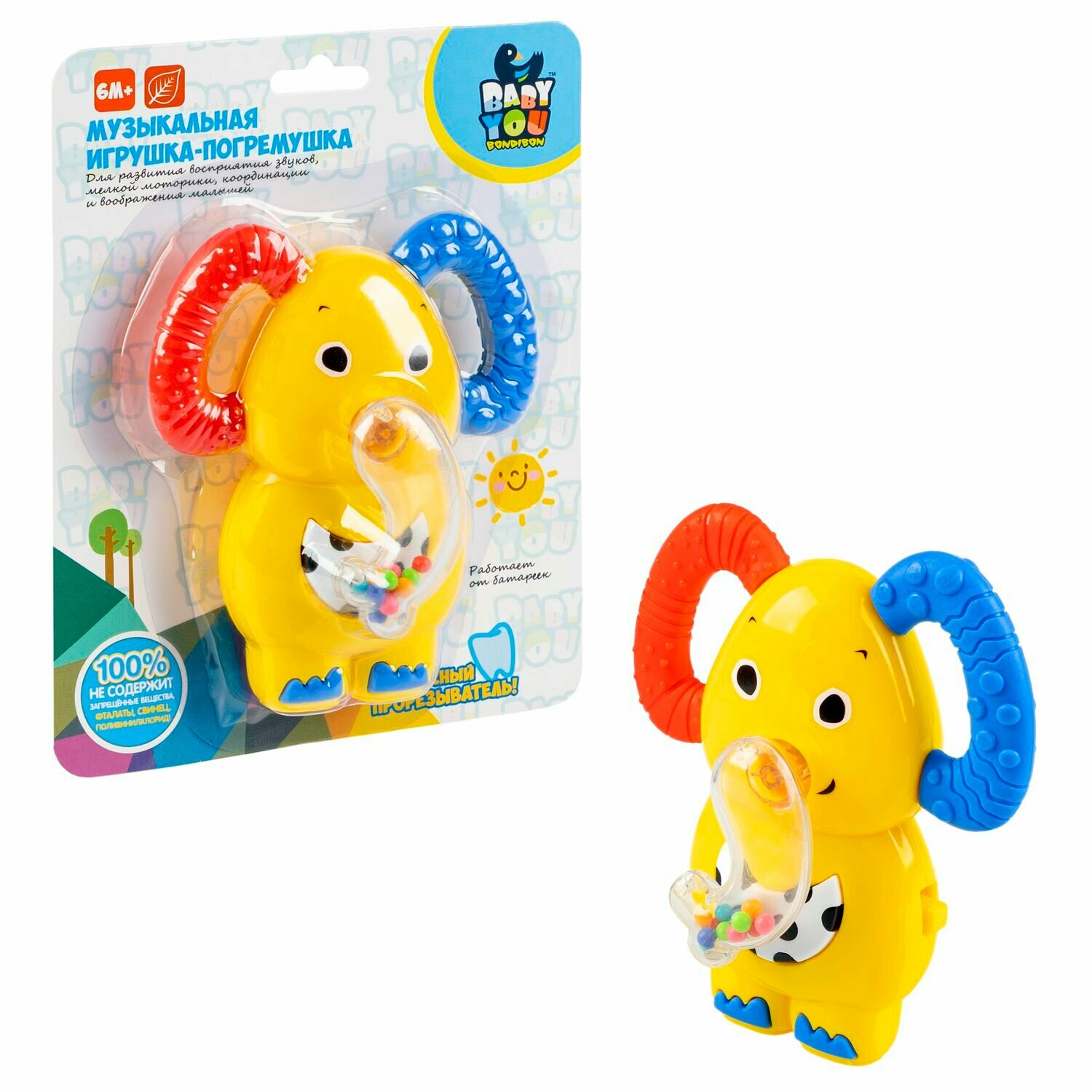 Игрушка-погремушка музыкальная ТМ Baby you Bondibon "Слон" предназначена для малышей от 6 месяцев. При нажатии на кнопку, расположенную на боку, а затем на воротничок звучат мелодии. Хобот со звуком можно двигать вправо, влево. Ушки слона являются безопасными прорезывателями. Игрушка поспособствует формированию тактильных ощущений, восприятия звуков, цветов и форм, поможет в развитии мелкой моторики и воображения Вашего малыша.