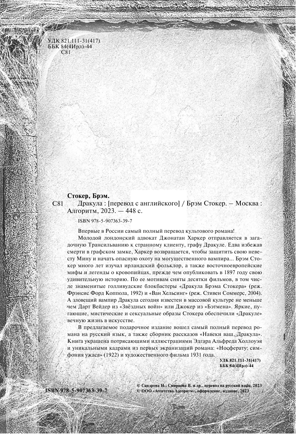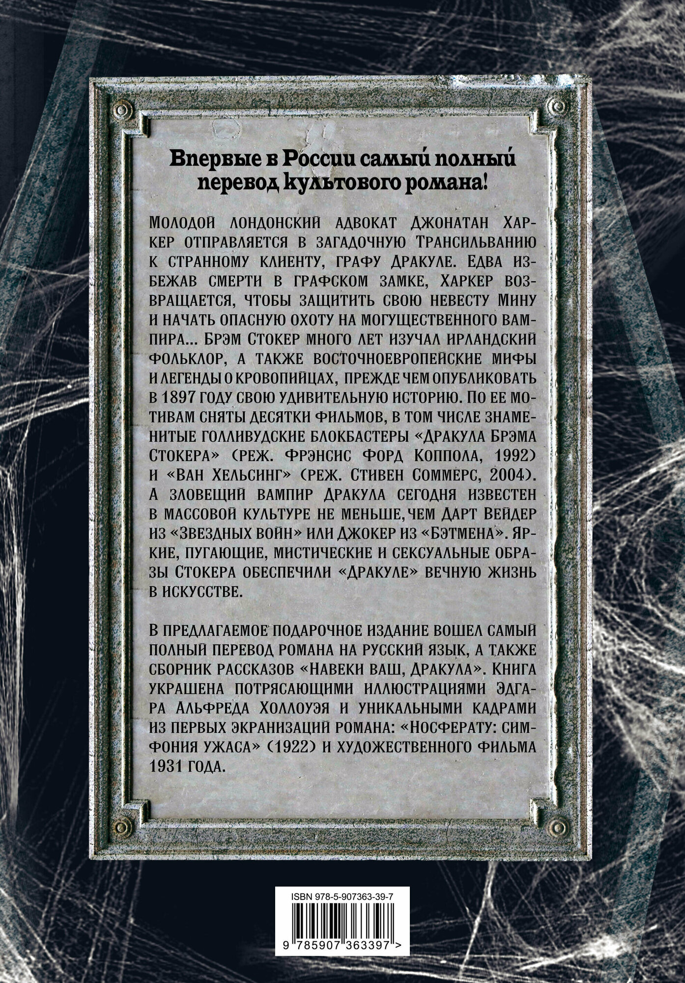 В предлагаемое подарочное издание вошел самый полный перевод романа на русский язык, а также сборник рассказов "Навеки ваш, Дракула". Книга украшена потрясающими иллюстрациями Эдгара Альфреда Холлоуэя и уникальными кадрами из первых экранизаций романа: "Носферату: симфония ужаса" (1922) и художественного фильма 1931 года.