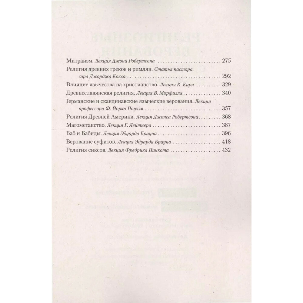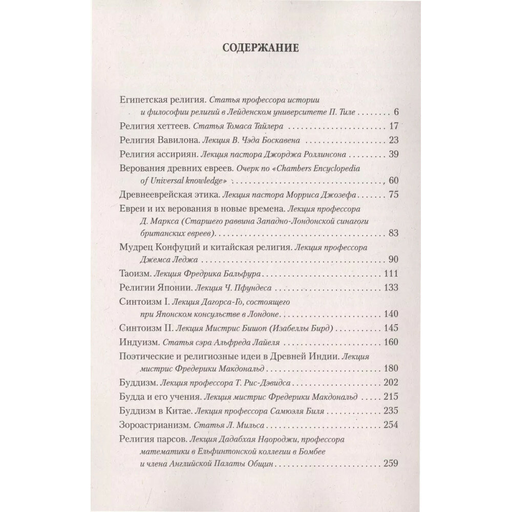 Настоящее издание представляет собой сборник переводов лекций по истории дохристианских и нехристианских религий, прочитанных в Лондоне в период с 1888 по 1891 гг. авторитетными исследователями данного раздела религиоведения. Перевод выполнен известным русским писателем, журналистом и переводчиком Василием Аркадьевичем Тимирязевым (1841-1912). Эта книга познакомит вас с интереснейшими сведениями о религии египтян, халдеев, вавилонян, ассирийцев и парсов, а также откроет перед вами тайны зороастризма, митраизма, суфизма и бабаизма. И, конечно же, авторы сборника не обходят стороной такие получившие широкое распространение религии, как иудаизм, индуизм, буддизм, даосизм и конфуцианство, приводя также любопытную информацию о древних верованиях славян, германцев и скандинавов. Издание предназначено для всех, интересующихся историей религий.