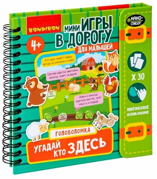 Порадуйте своего ребенка игрой Угадай, Кто Здесь с наностикерами от Bondibon в удобном дорожном формате. Малыши не смогут оторваться от красочной головоломки с многоразовыми наклейками и увлекательными заданиями.