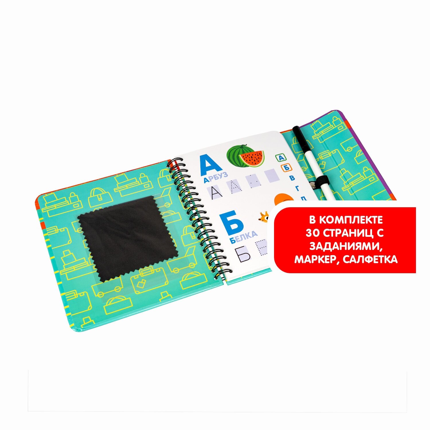 Выберите любую из тридцати карточек с красочными рисунками. Прочитайте задание. Впишите ответы стирающимся маркером. Не бойтесь ошибиться, стирайте ответы и выполняйте задания сколько угодно раз. Находите буквы, соединяйте картинки и отгадывайте загадки! На последней странице книжки Вы найдете алфавит. Игра для малышей Изучаем Алфавит способствует развитию логического мышления, интеллектуальных способностей, усидчивости и внимания.