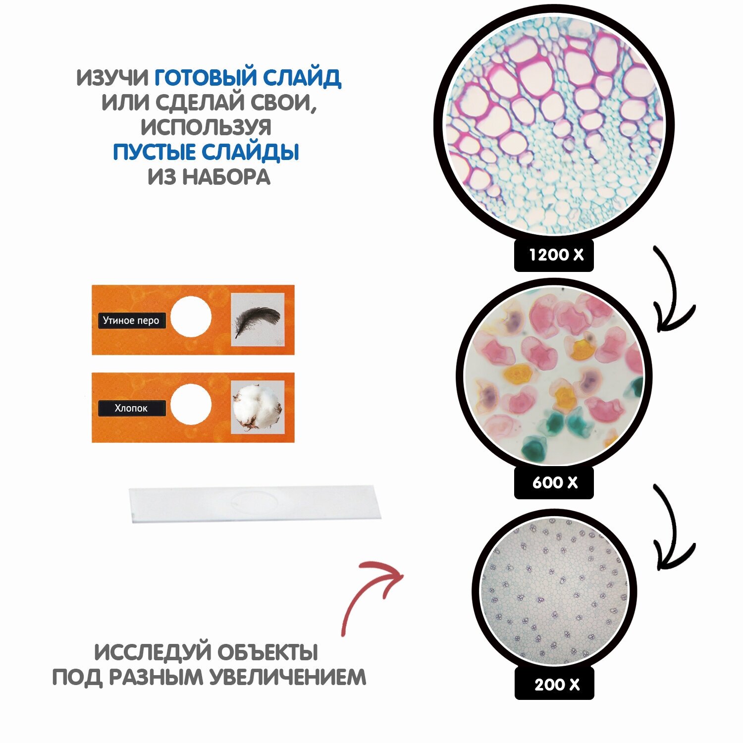 Микроскоп обладает 200х, 600х и 1200х увеличением и специальным штативом для съемки на камеру смартфона. Вращение регулятора фокусировки на 360 градусов, возможность менять угол наклона корпуса и высоту оптической линзы объектива, светодиодная и зеркальная подсветка, а также цветные светофильтры позволяют добиваться очень высокой чёткости изображения.