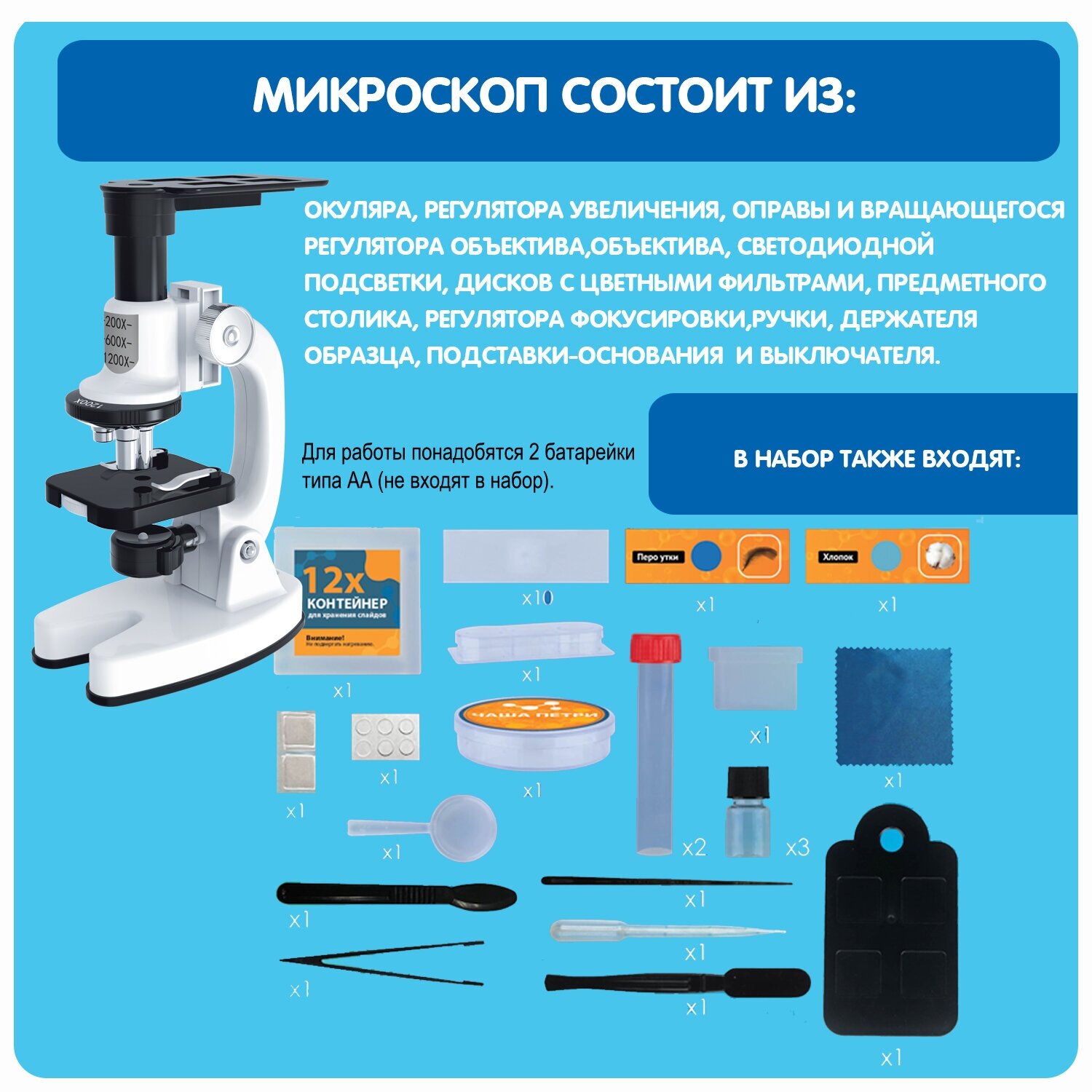 В набор для исследований входят микроскоп, крепление для мобильного телефона, чаша Петри, контейнер и устройства для сбора образцов, 10 пустых и 2 слайда с образцами для исследований. Для работы устройства потребуются 2 батарейки АА (не входят в набор).