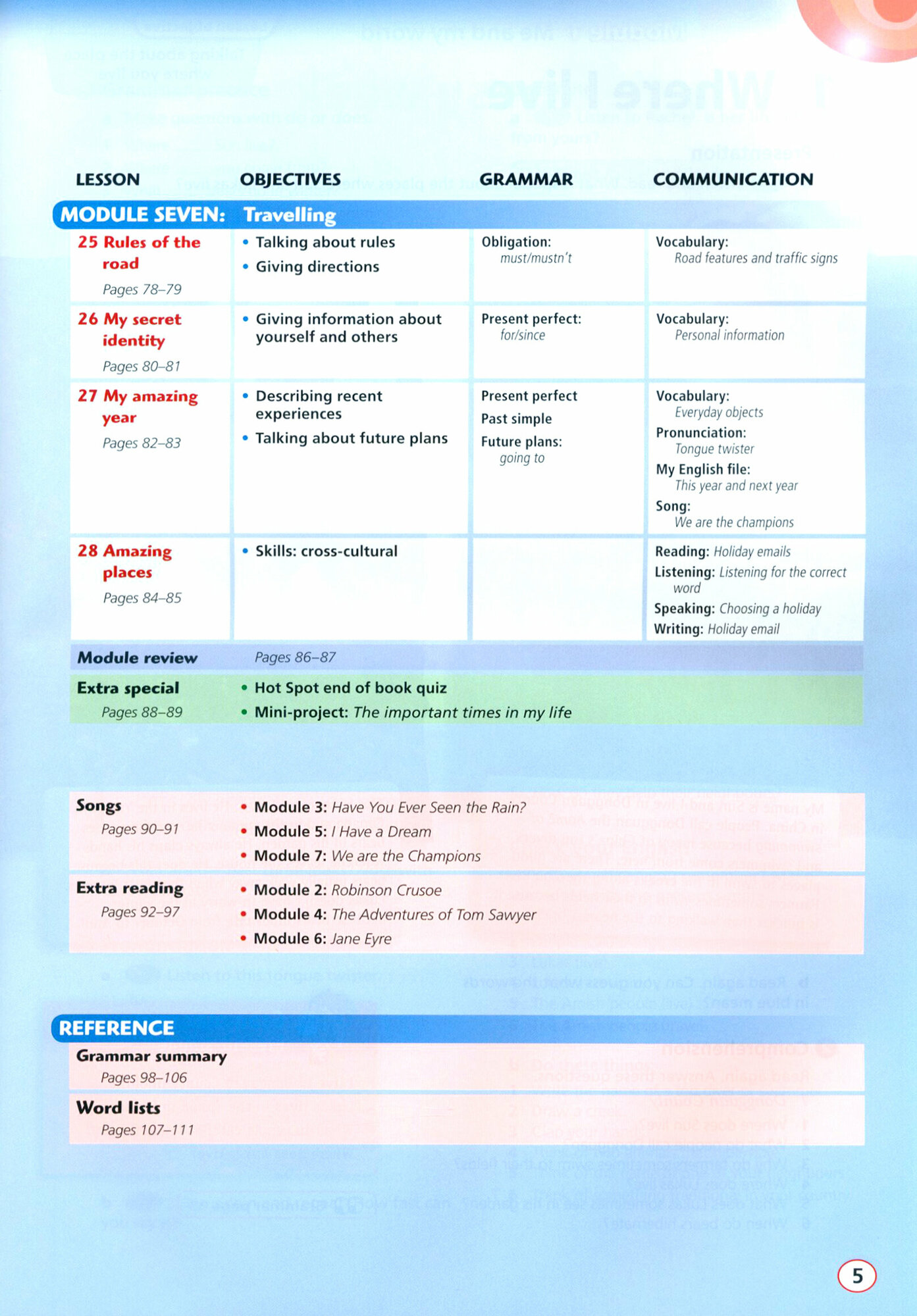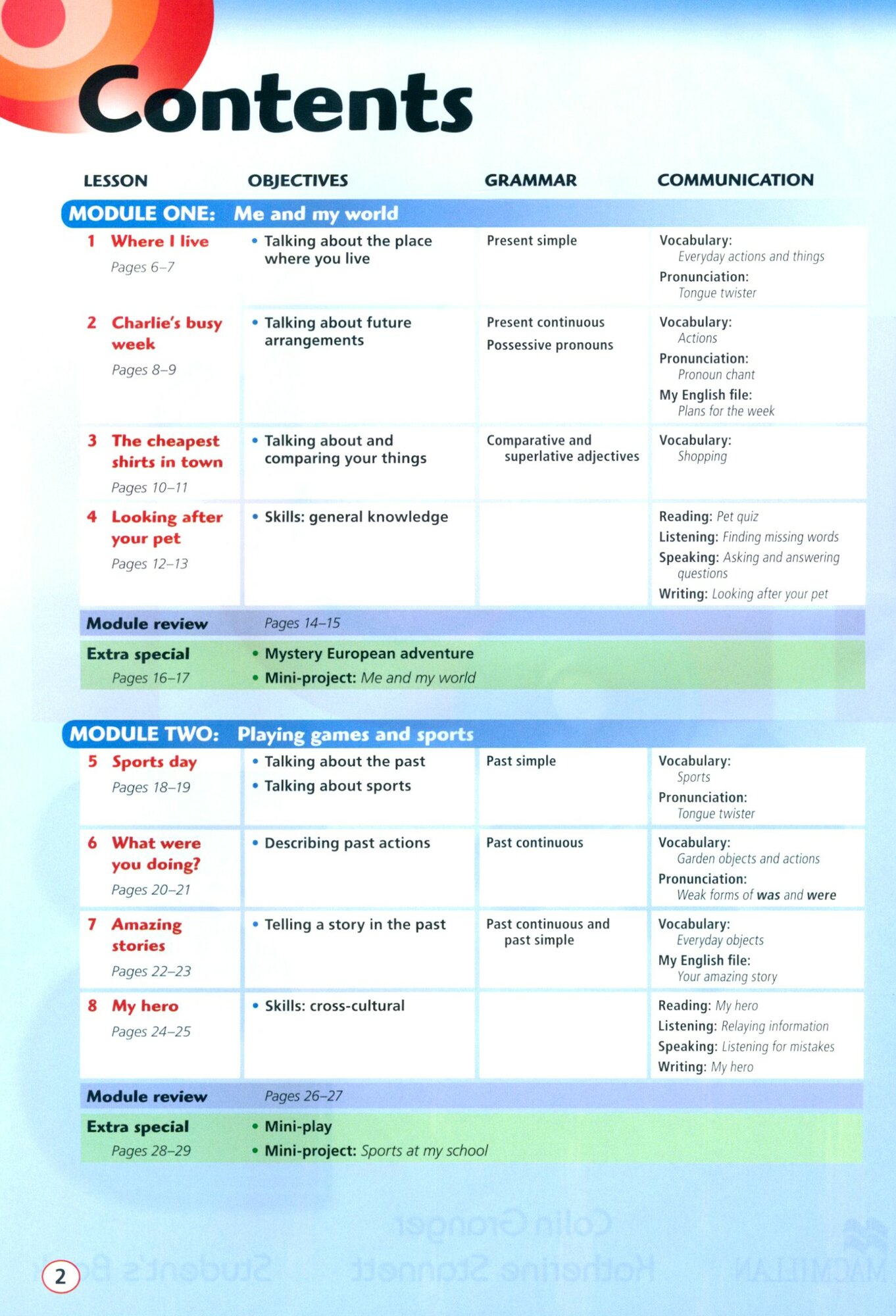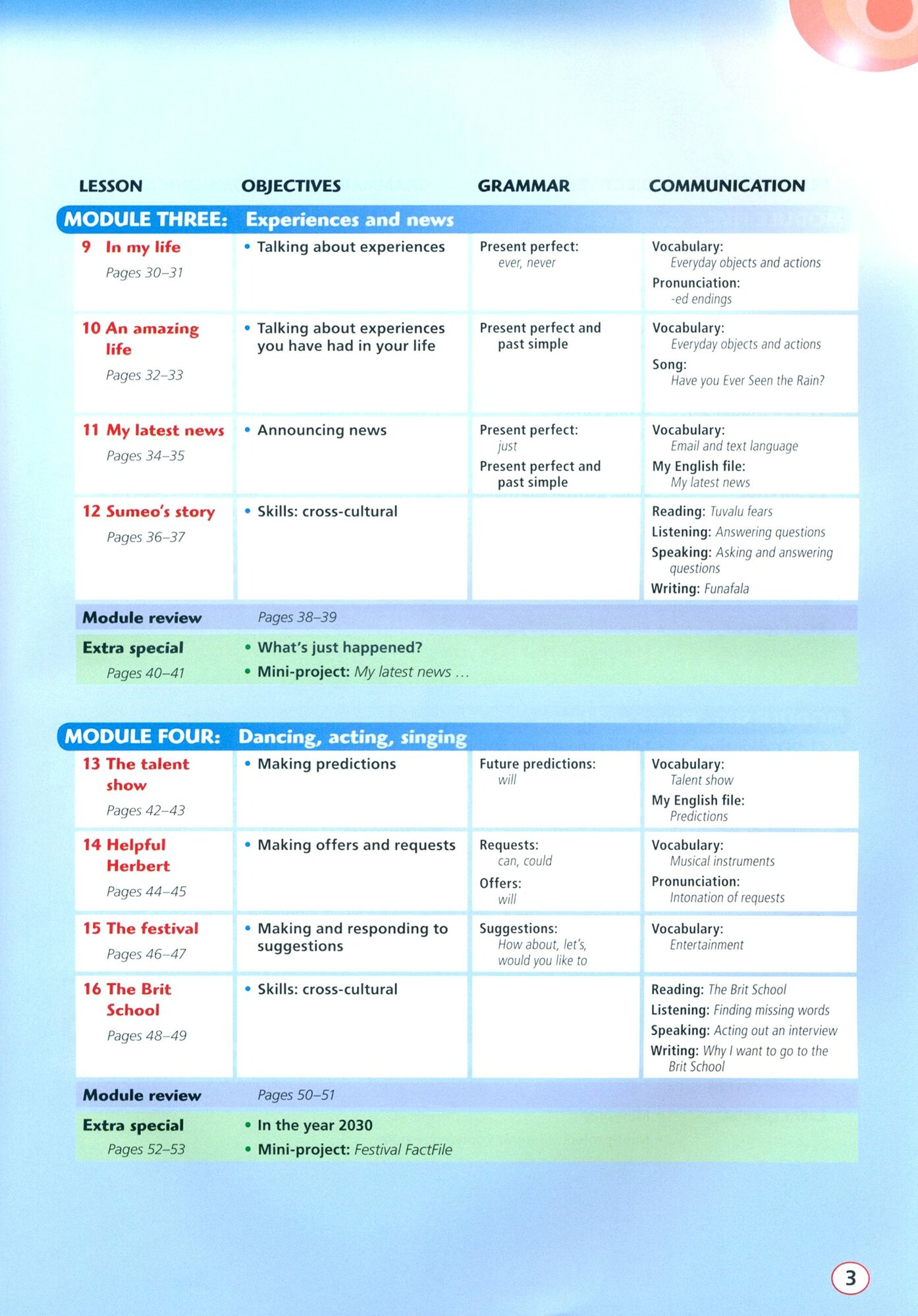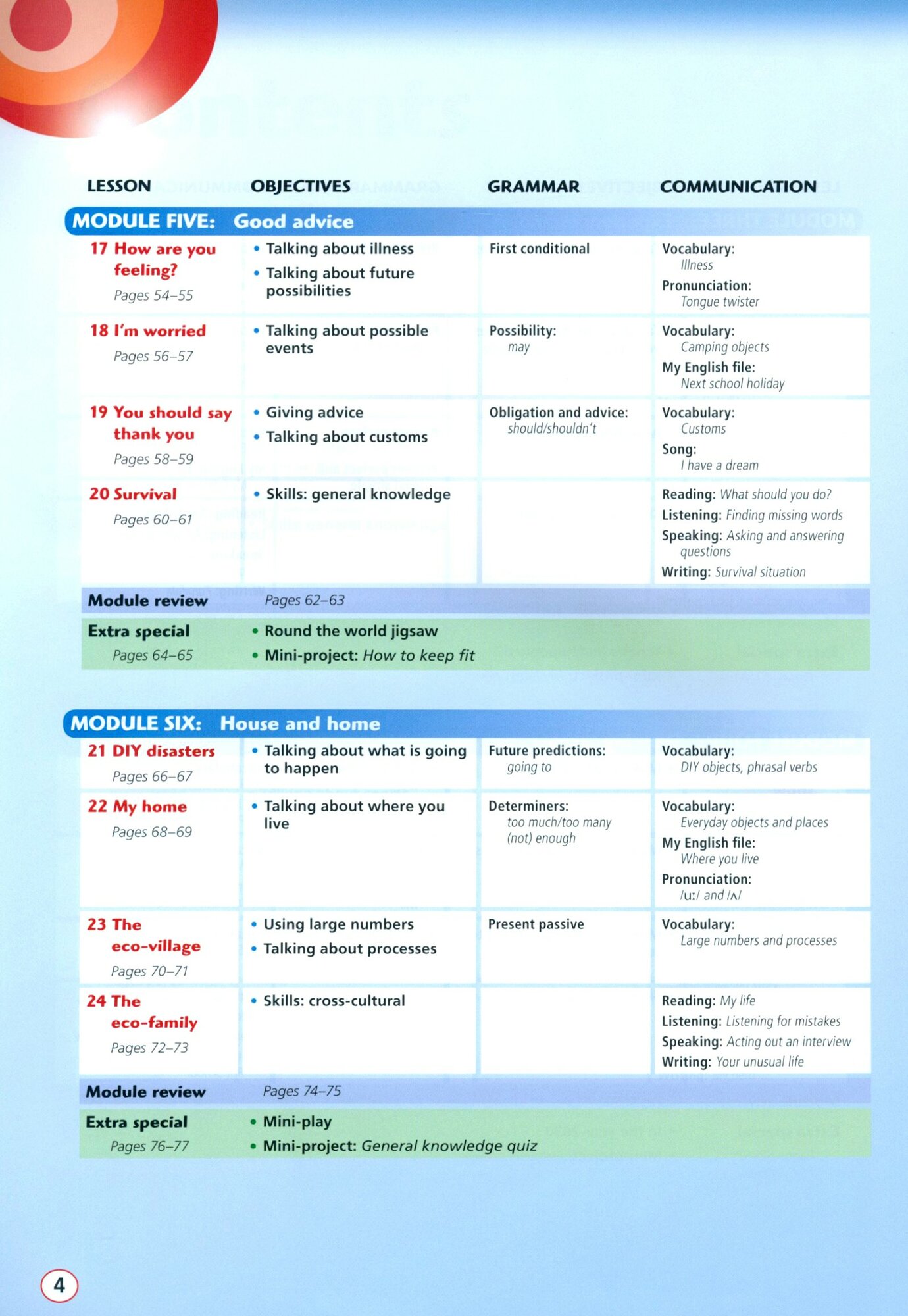 Учебник состоит из семи основных тематических модулей, нацеленных на развитие основных навыков владения английским языком. В каждом модуле содержится четыре урока, последний из которых (Skills: Cross-cultural) построен на социокультурном материале. Модуль завершается заданиями на повторение (Module review) и дополнительным развивающим материалом (Extra special), в который, в том числе, входит проектное задание (Mini project).