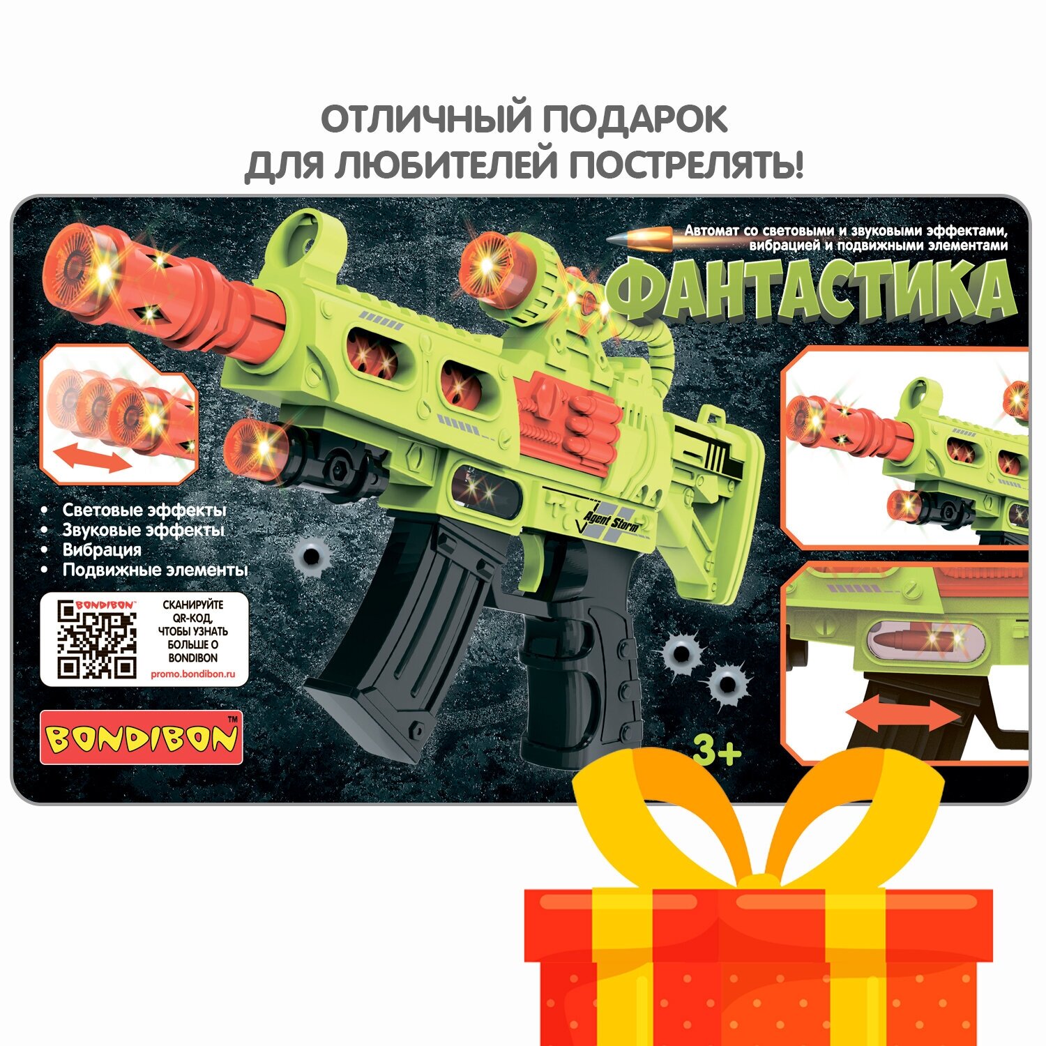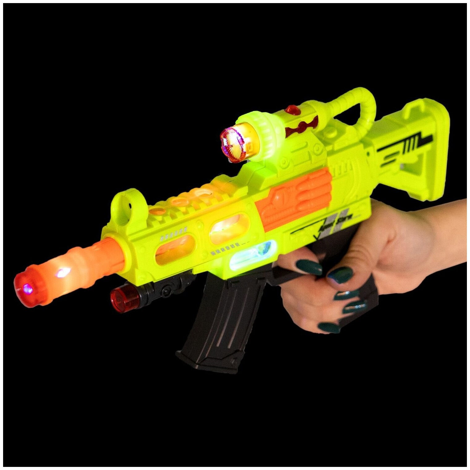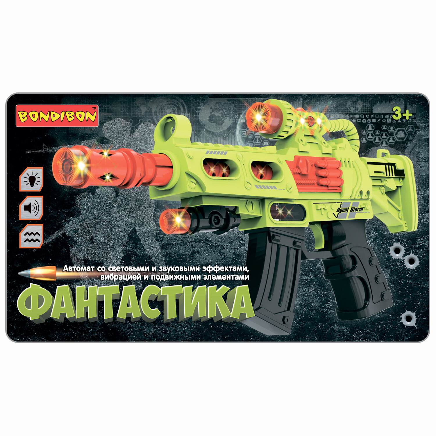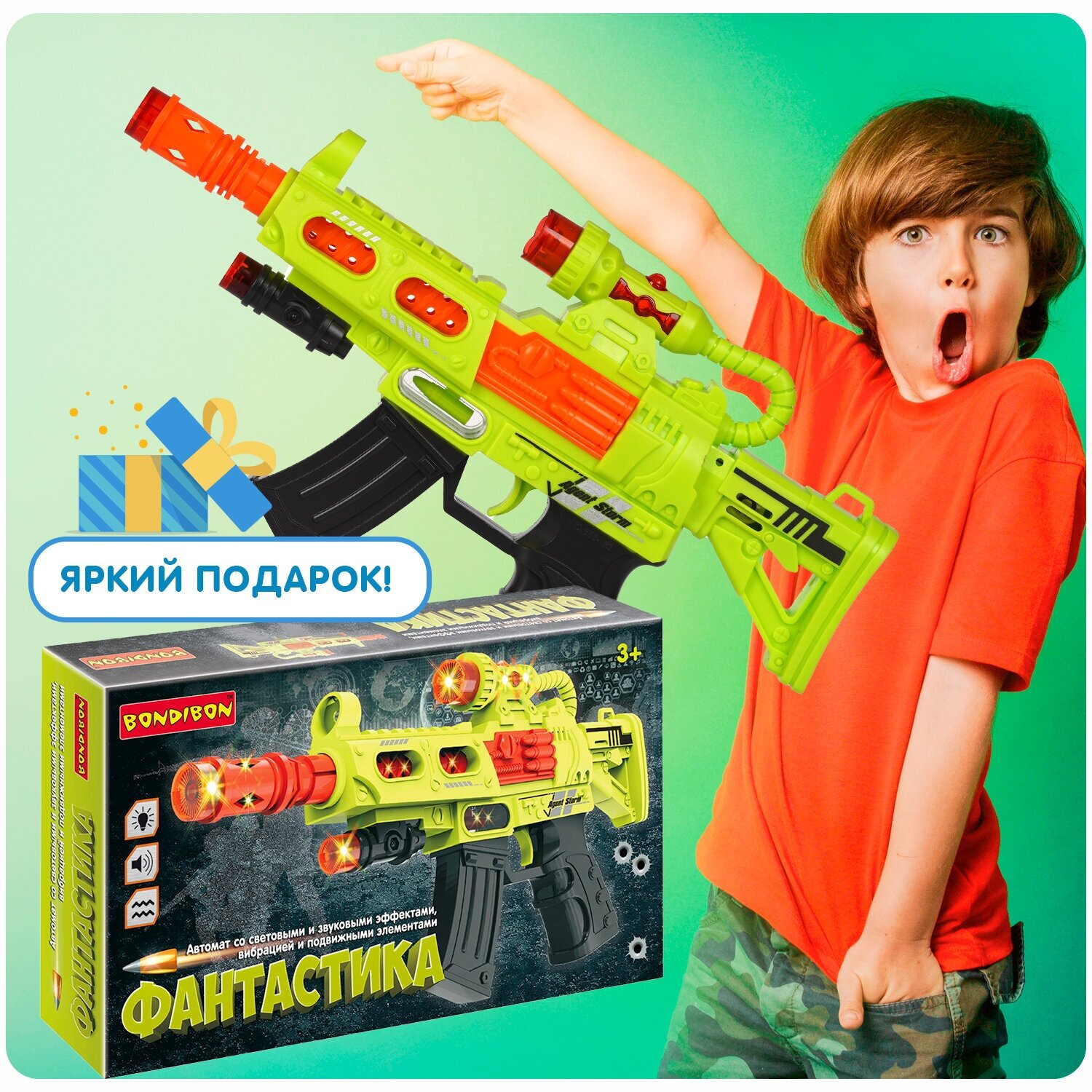Игрушечное супер оружие автомат от Bondibon светится, стреляет с межгалактическими звуками и спецэффектами. Во время стрельбы в пистолете движется дуло, ощущается вибрация, подсвечивается фиксированный патрон пуля.