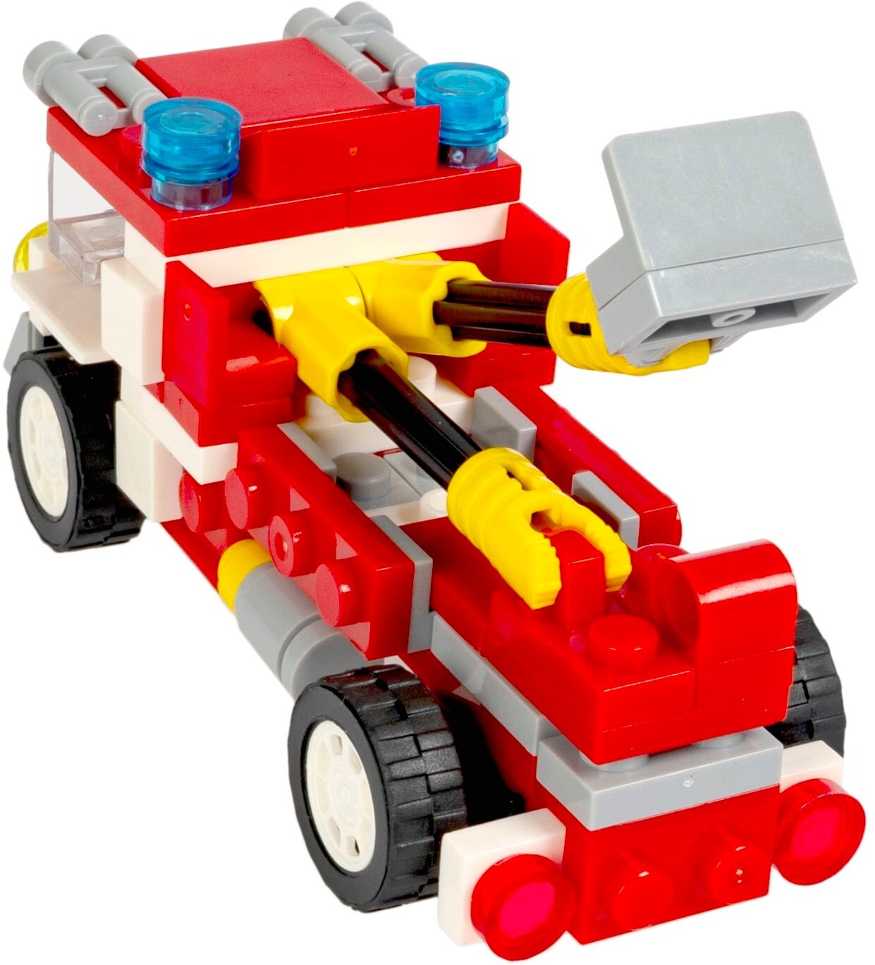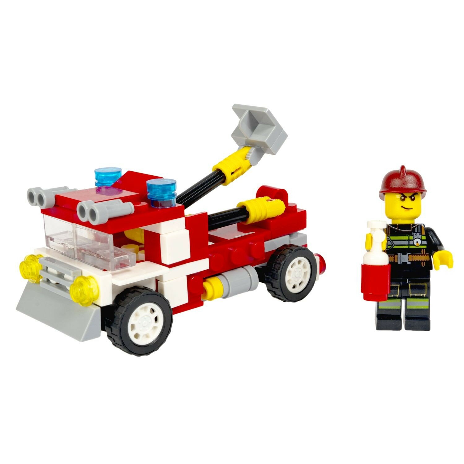 Используя инструкцию, соберите пожарную машину и фигурку пожарного в форме. У игрушечного человечка есть аксессуары для того, чтобы безопасно выполнить свою работу - шлем каска, мощный огнетушитель.