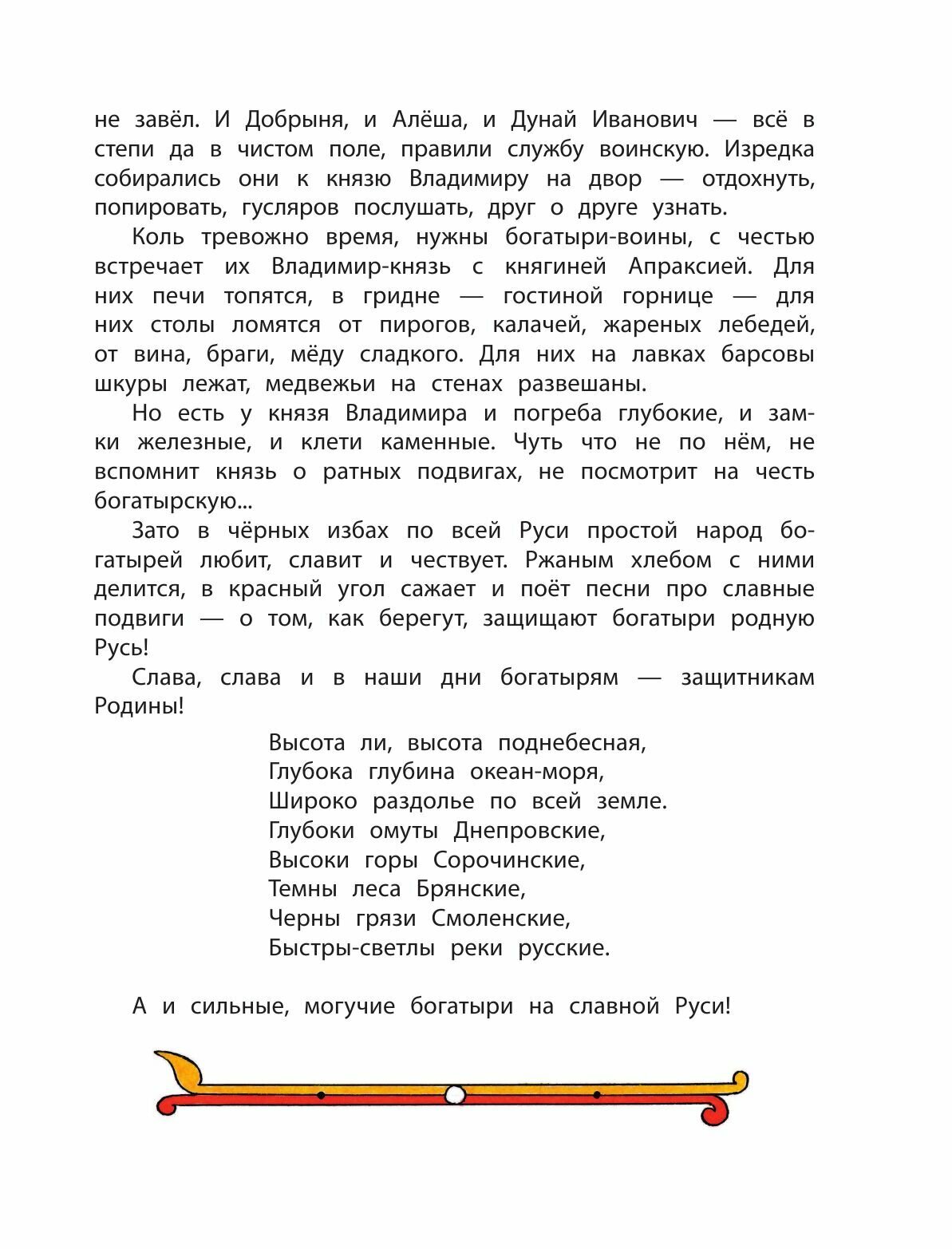 Качество хорошее. Крепкий переплёт, красочные форзацы, плотная белая, бумага. Много цветных иллюстраций разного размера, которые детям очень нравится рассматривать. А в начале былин виньетки, что добавляет изящества и атмосферности. Нарисовано, я бы сказала, нарочито просто, весело и ярко, чтобы развлечь малышей, и это работает. Только человеческие лица не очень понравились, специфические какие-то, но это дело вкуса. Былины даются в качественном пересказе, без ущерба для содержания и без потери смысла. Читаются быстро, легко и, самое главное, с удовольствием. Шрифт крупный, с буквой Ё, что важно, если ребёнок читает сам, это поможет неопытному читателю не запутаться.