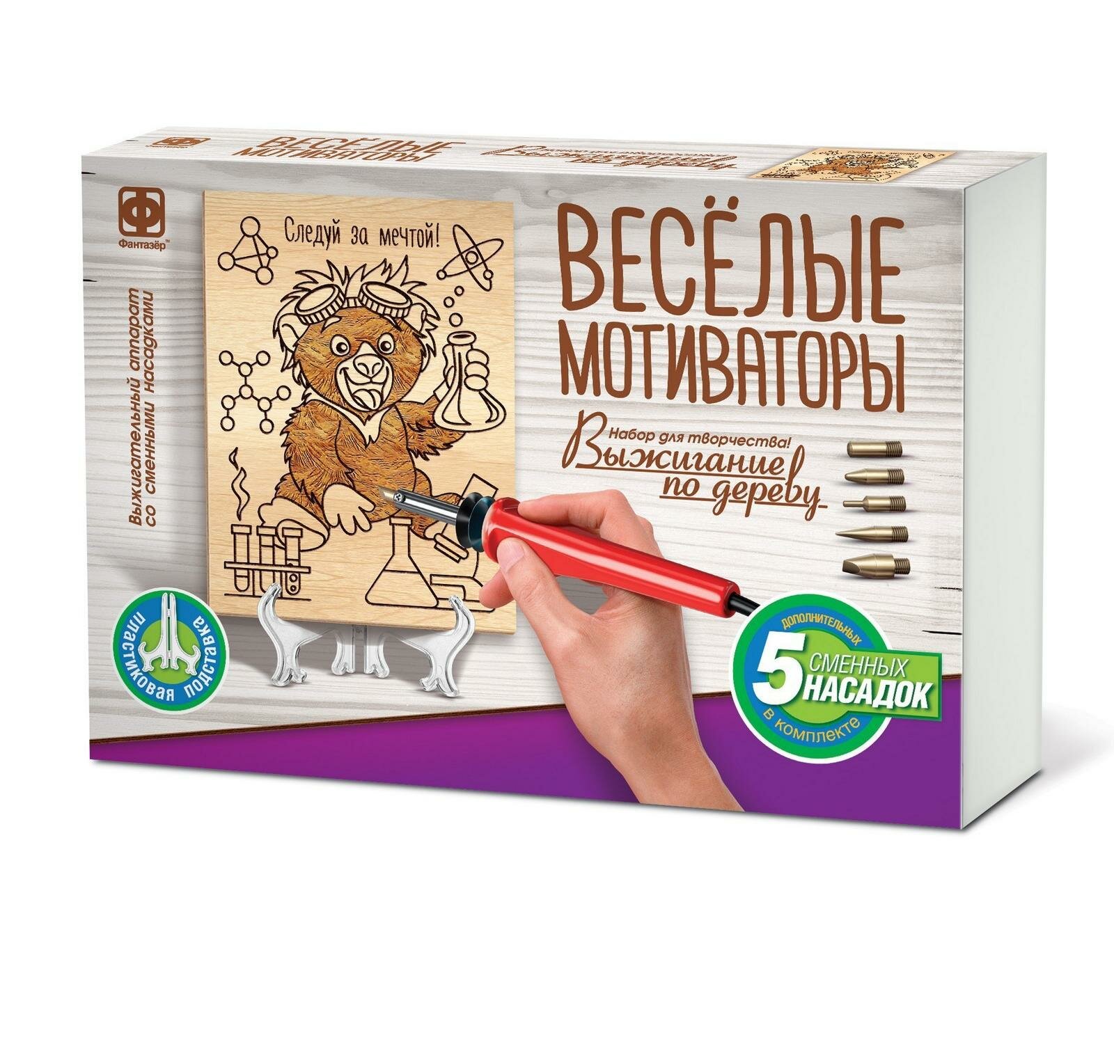 Набор для творчества "Выжигание по дереву Веселые Мотиваторы" - это создание с помощью техники "выжигание" забавных деревянных картинок, которые каждый день будут напоминать, что жизнь прекрасна и мотивировать всех членов семьи улыбаться чаще! Особенно если картинку разместить на видном месте или установить на любой полочке с помощью пластикового мольберта.