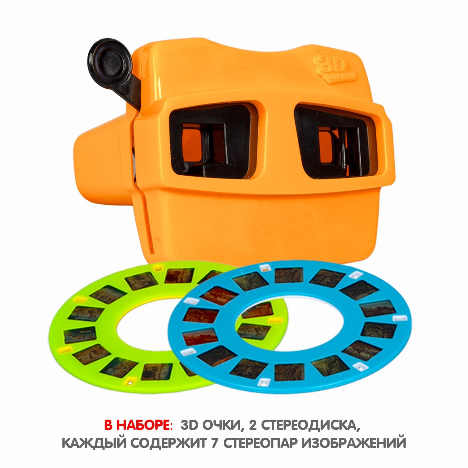 В комплект входят 3D очки оранжевого цвета и два диска с 14 фотографиями.