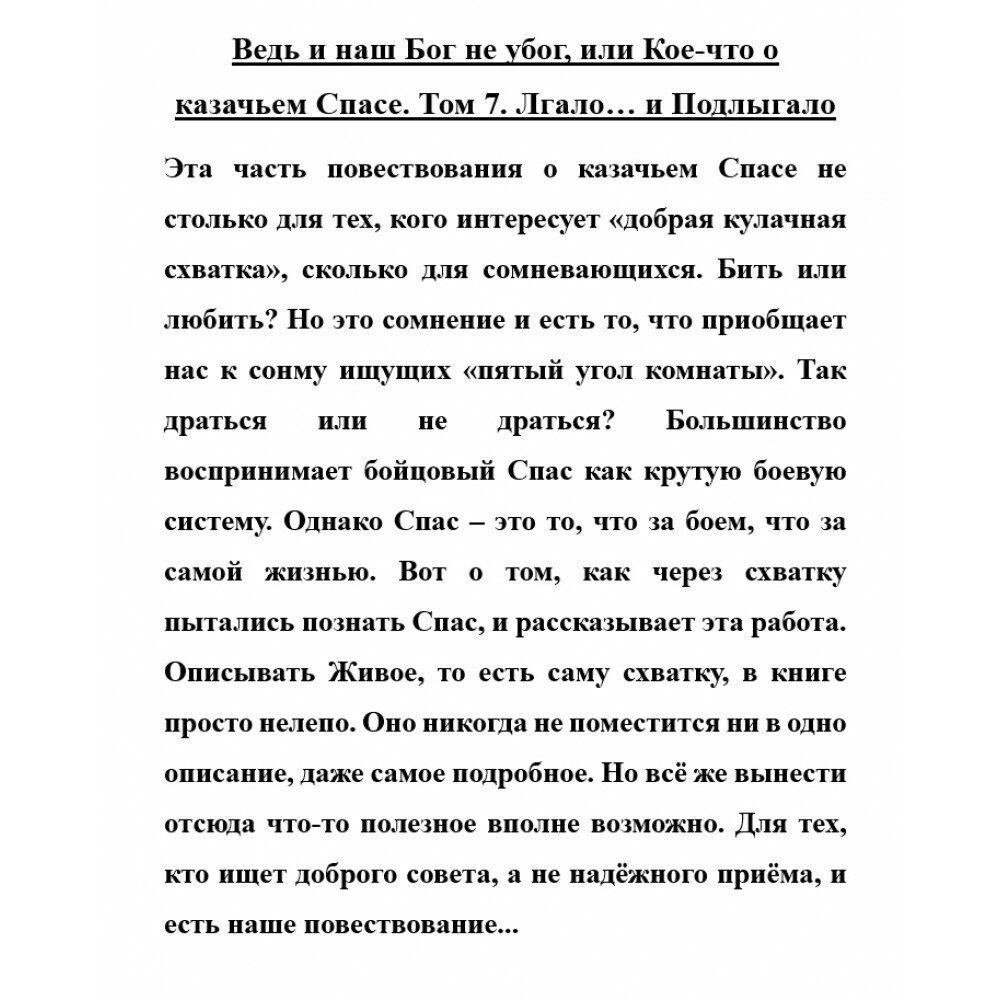 Эта часть повествования о казачьем Спасе не столько для тех, кого интересует "добрая кулачная схватка", сколько для сомневающихся. Бить или любить? Но это сомнение и есть то, что приобщает нас к сонму ищущих "пятый угол комнаты". Так драться или не драться? Большинство воспринимает бойцовый Спас как крутую боевую систему. Однако Спас - это то, что за боем, что за самой жизнью. Вот о том, как через схватку пытались познать Спас, и рассказывает эта работа. Описывать Живое, то есть саму схватку, в книге просто нелепо. Оно никогда не поместится ни в одно описание, даже самое подробное. Но всё же вынести отсюда что-то полезное вполне возможно. Для тех, кто ищет доброго совета, а не надёжного приёма, и есть наше повествование...
