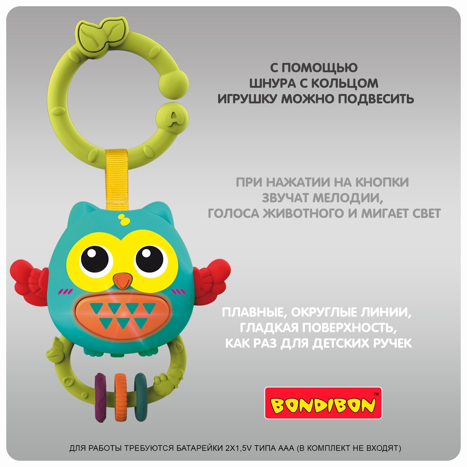 Погремушка Сова серии Baby You от Bondibon способствует формированию тактильных ощущений, восприятию звуков, цветов и форм, помогает в развитии мелкой моторики и воображения Вашего малыша. Нажмите кнопку на животе модели - игрушка будет проигрывать мелодии, издавать звуки различных зверей, мигать светом. Дайте ребенку самостоятельно освоить новый для него навык, его радости не будет предела.