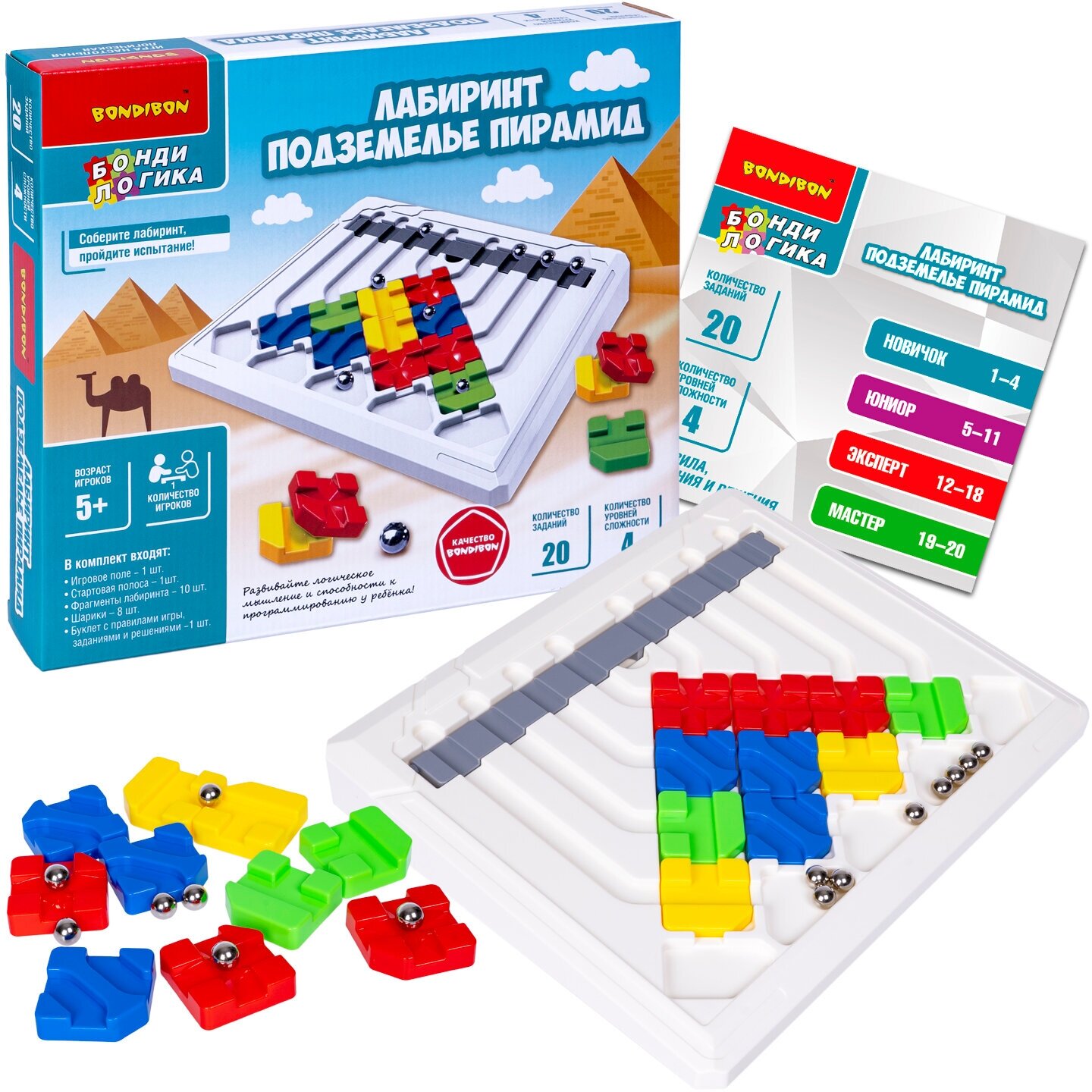 В комплект входят: игровое поле, стартовая полоса, 10 фрагментов лабиринта, 8 шариков, буклет с правилами игры, заданиями и решениями.