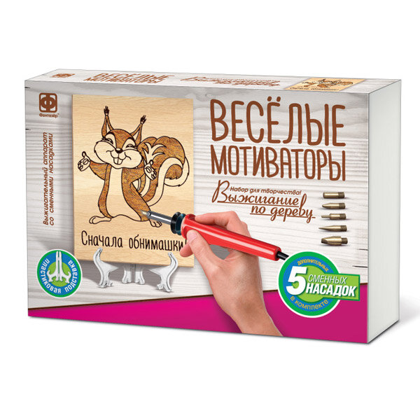 Набор для творчества "Выжигание по дереву Веселые Мотиваторы" - это создание с помощью техники "выжигание" забавных деревянных картинок, которые каждый день будут напоминать, что жизнь прекрасна и мотивировать всех членов семьи улыбаться чаще! Особенно если картинку разместить на видном месте или установить на любой полочке с помощью пластикового мольберта.